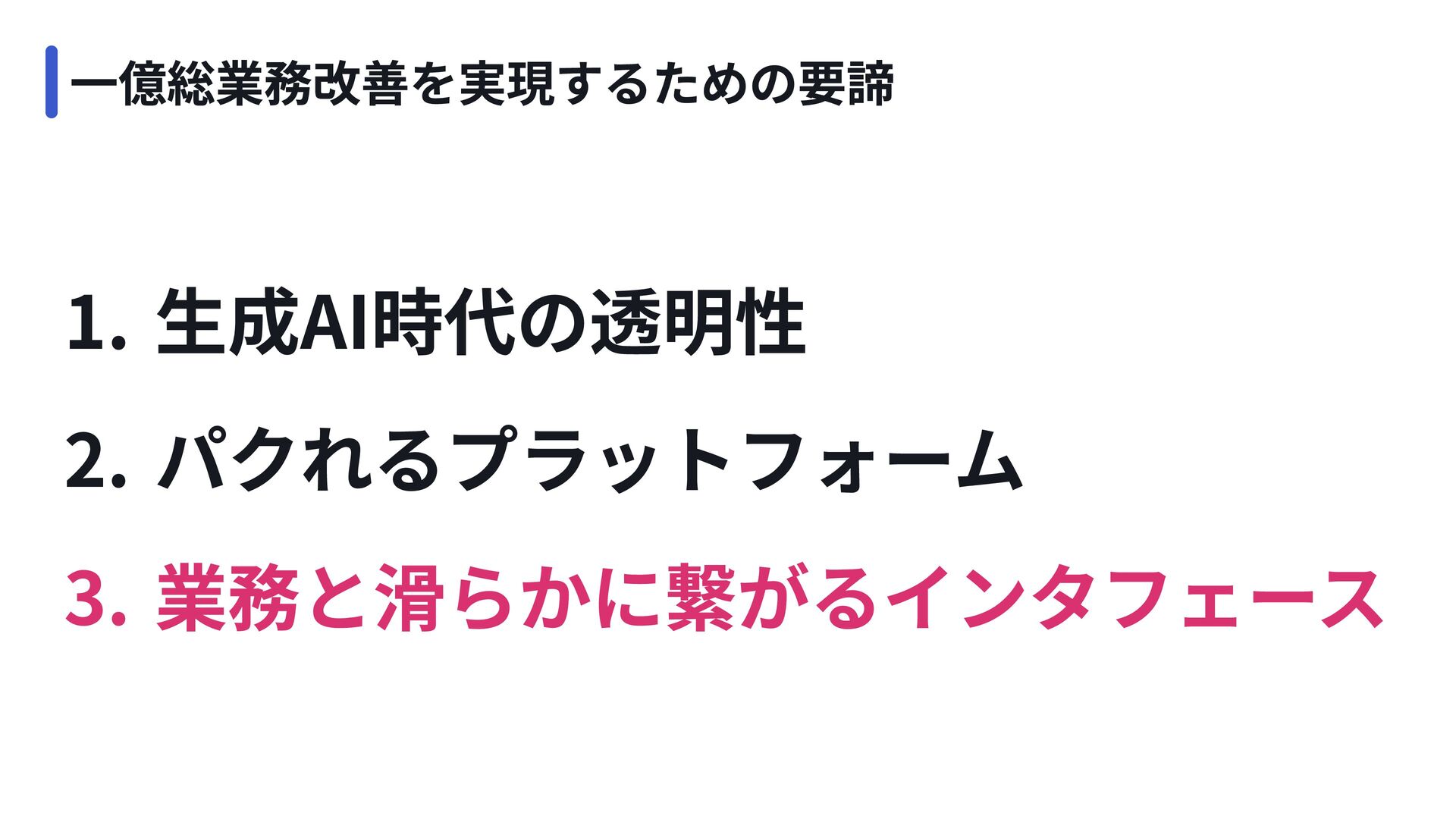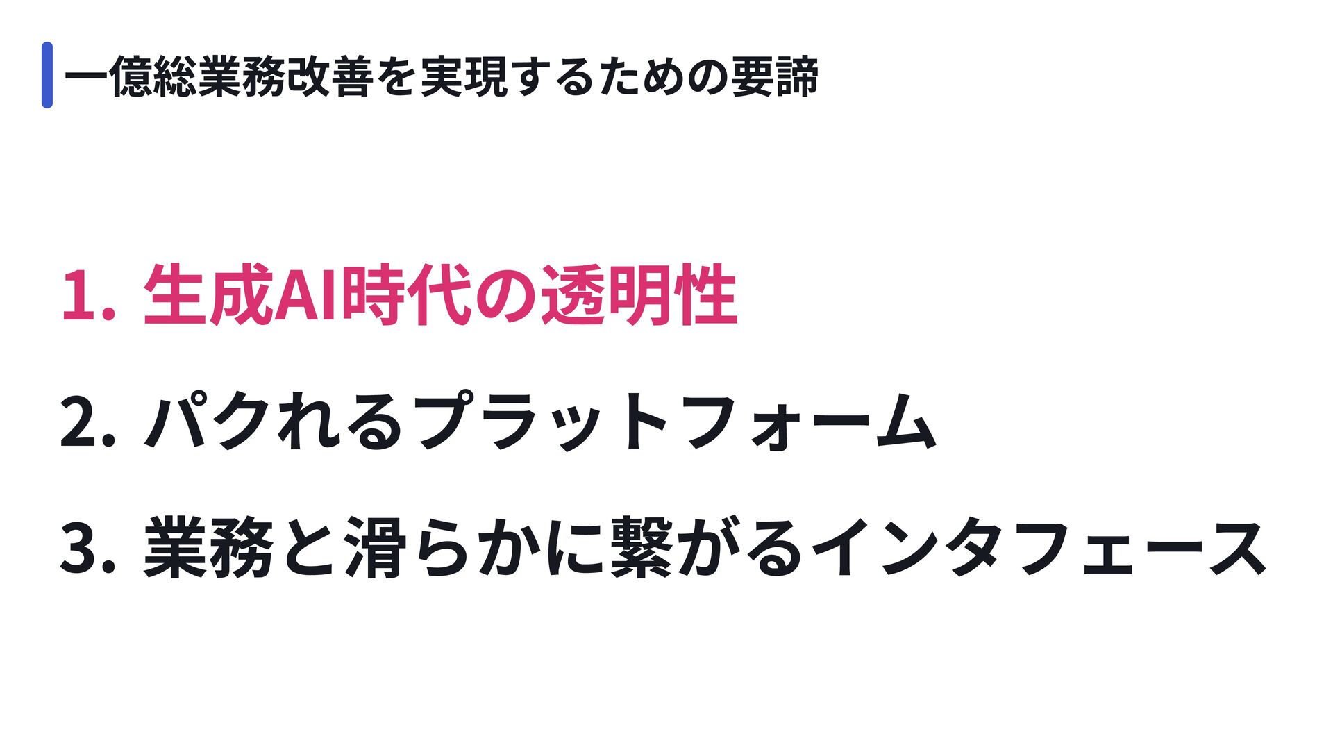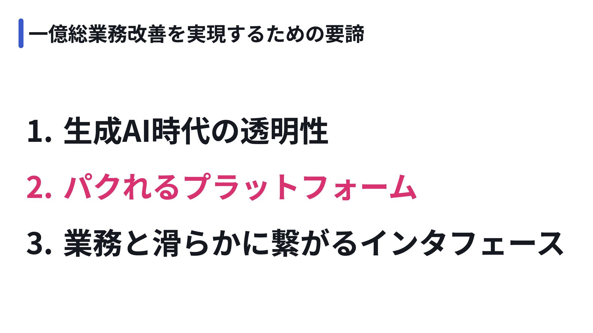 一億総業務改善を実現するための要諦 生成AI時代の透明性 パクれるプラットフォーム 業務と滑らかに繋がるインタフェース