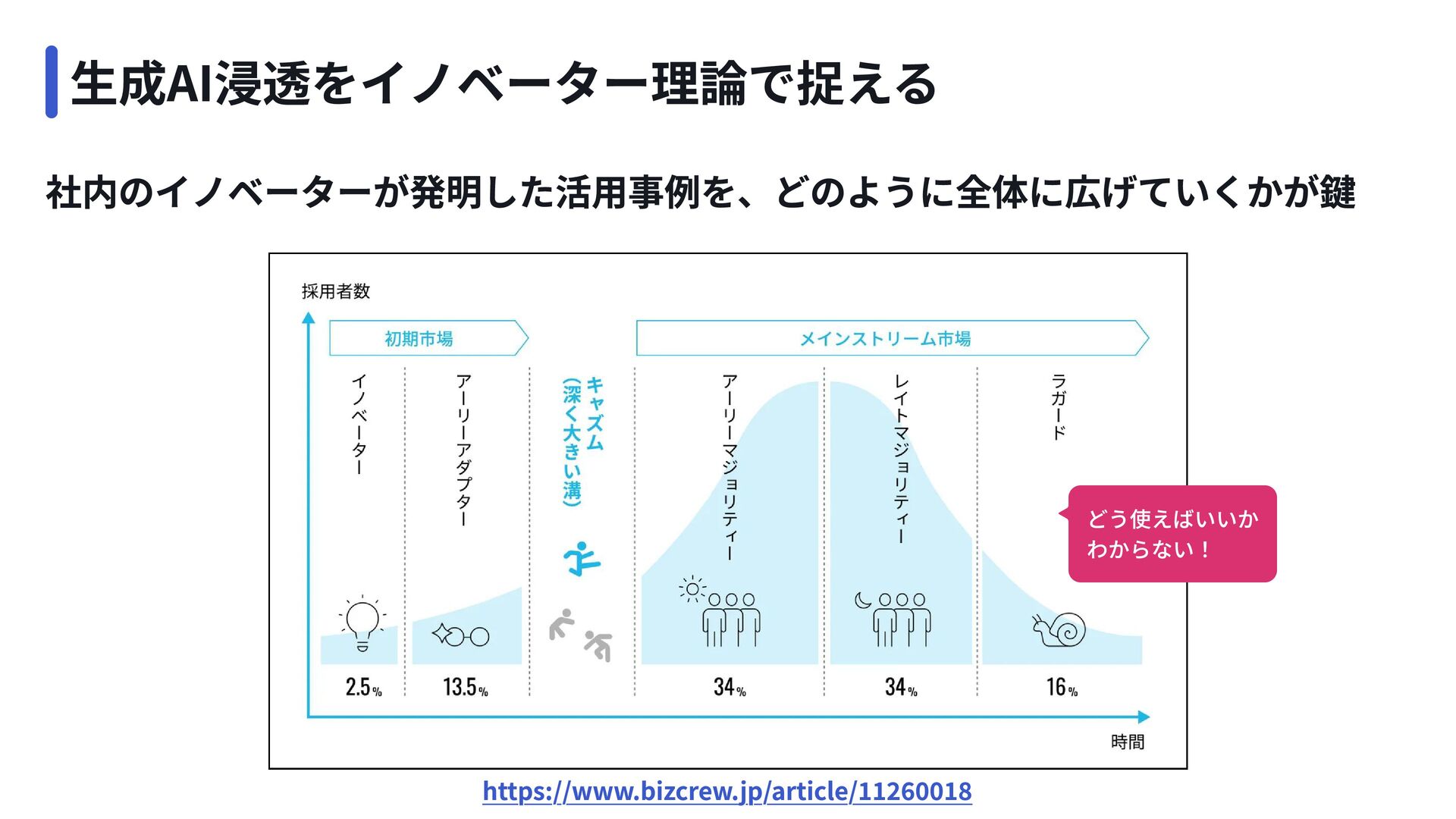 生成AI浸透をイノベーター理論で捉える 社内のイノベーターが発明した活用事例を、どのように全体に広げていくかが鍵 https://www.bizcrew.jp/article/11260018 どう使えばいいか わからない!