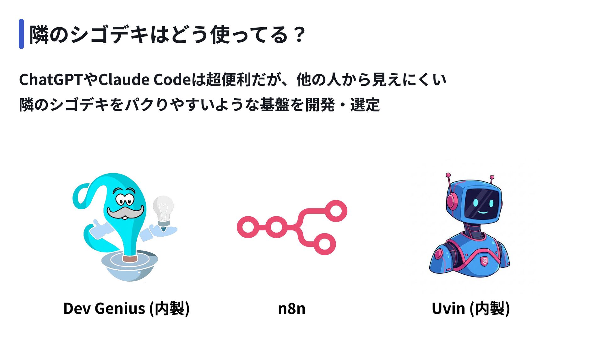 隣のシゴデキはどう使ってる? ChatGPTやClaude Codeは超便利だが、他の人から見えにくい 隣のシゴデキをパクりやすいような基盤を開発・選定 Dev Genius (内製) n8n Uvin (内製)