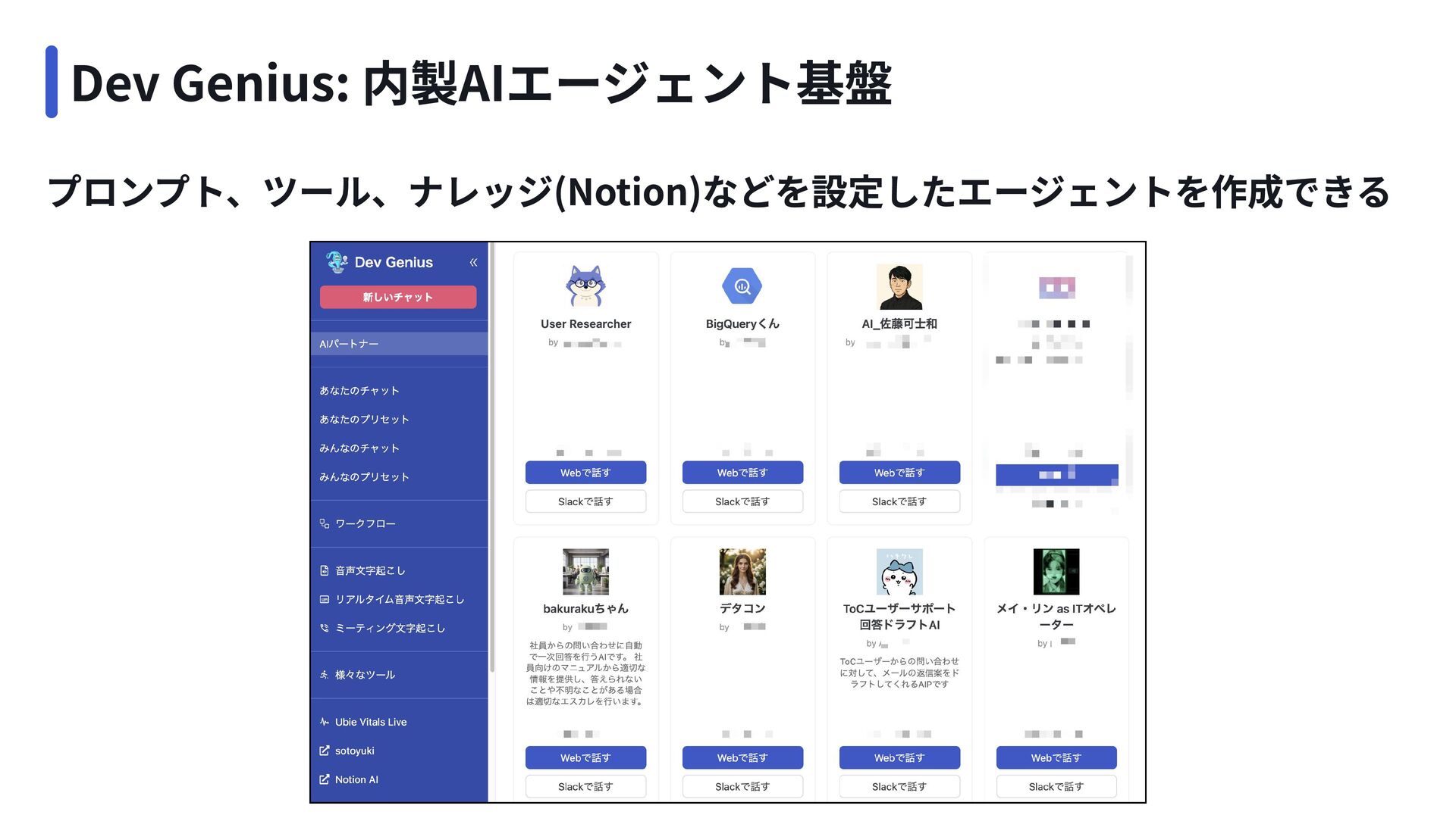 Dev Genius: 内製AIエージェント基盤 プロンプト、ツール、ナレッジ(Notion)などを設定したエージェントを作成できる