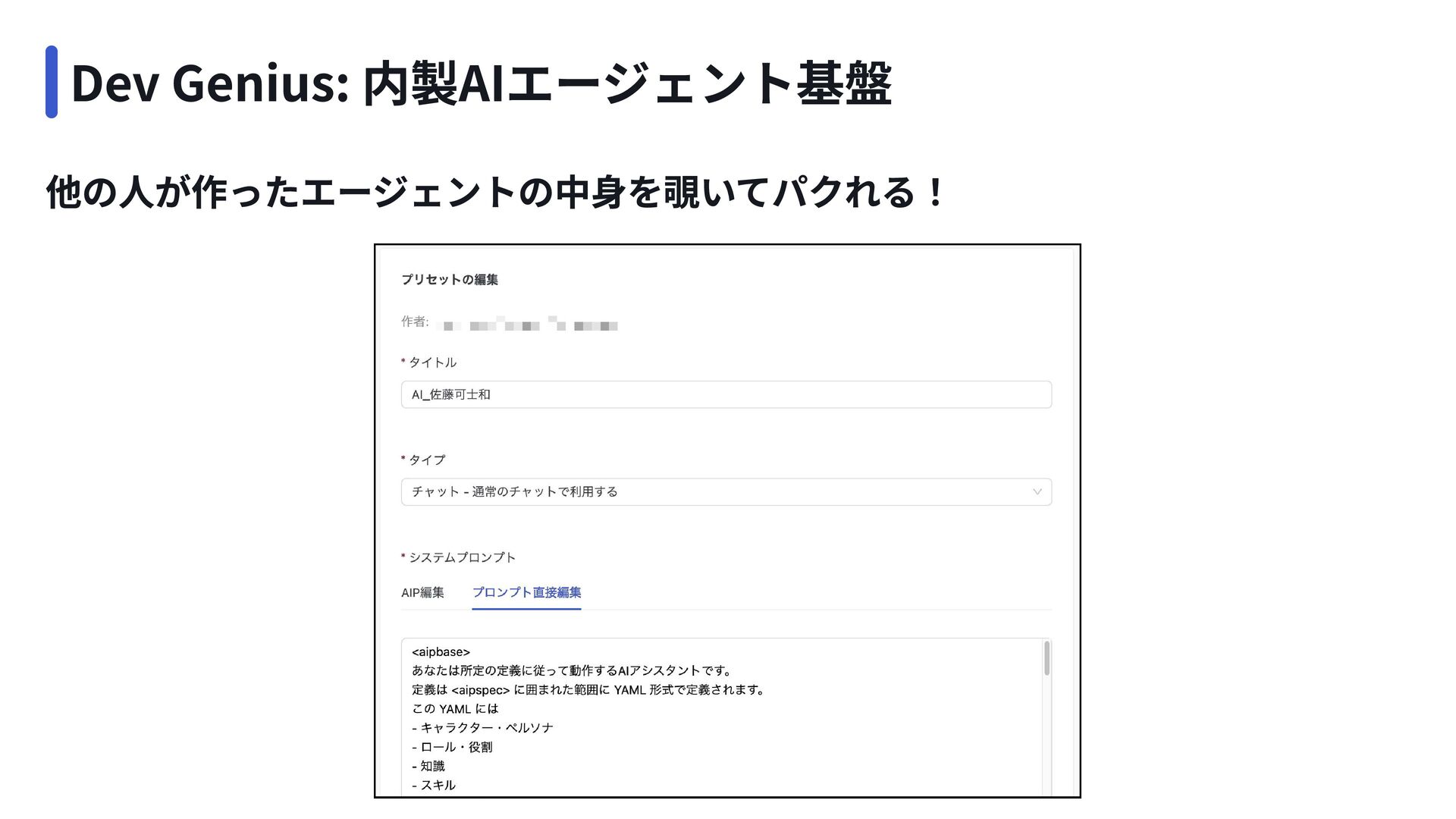 Dev Genius: 内製AIエージェント基盤 他の人が作ったエージェントの中身を覗いてパクれる!