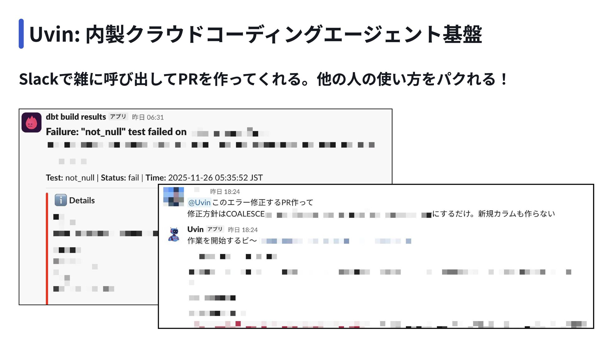 Uvin: 内製クラウドコーディングエージェント基盤 Slackで雑に呼び出してPRを作ってくれる。他の人の使い方をパクれる!