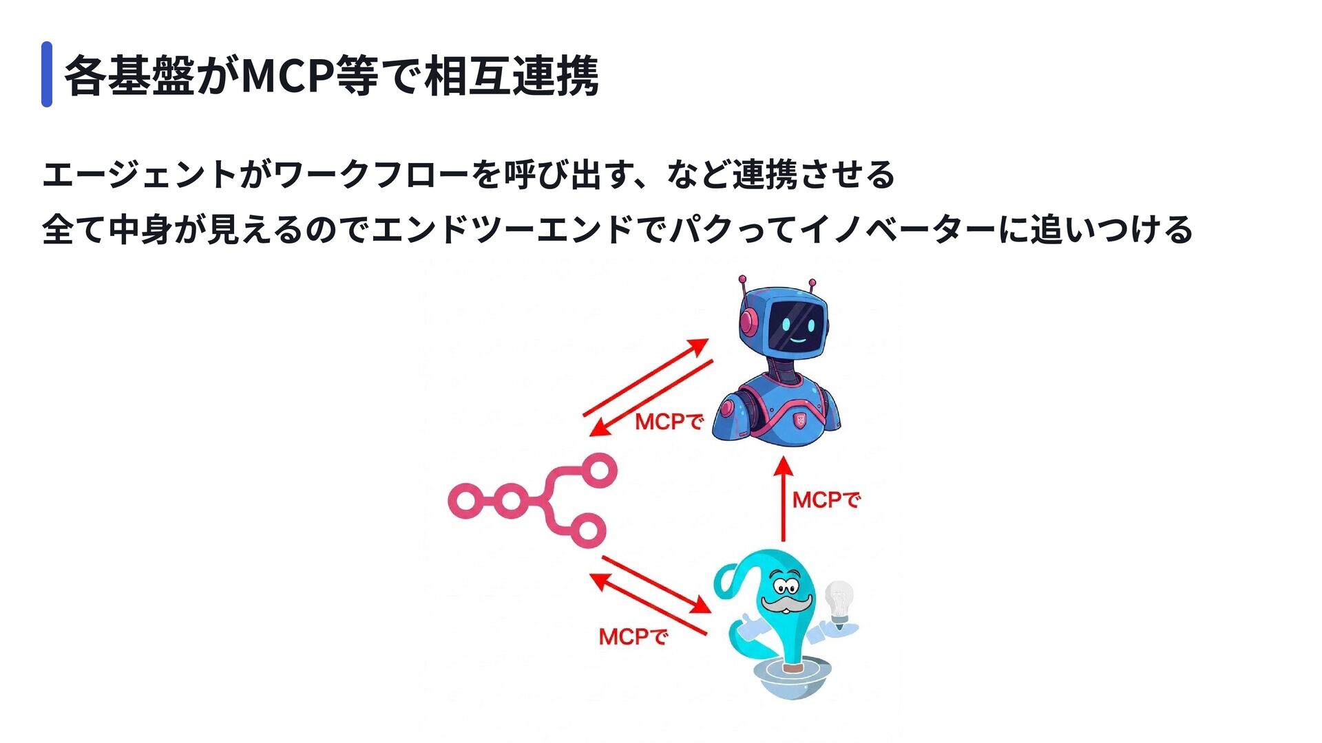 各基盤がMCP等で相互連携 エージェントがワークフローを呼び出す、など連携させる 全て中身が見えるのでエンドツーエンドでパクってイノベーターに追いつける