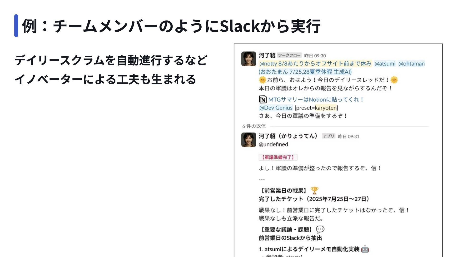例:チームメンバーのようにSlackから実行 デイリースクラムを自動進行するなど イノベーターによる工夫も生まれる