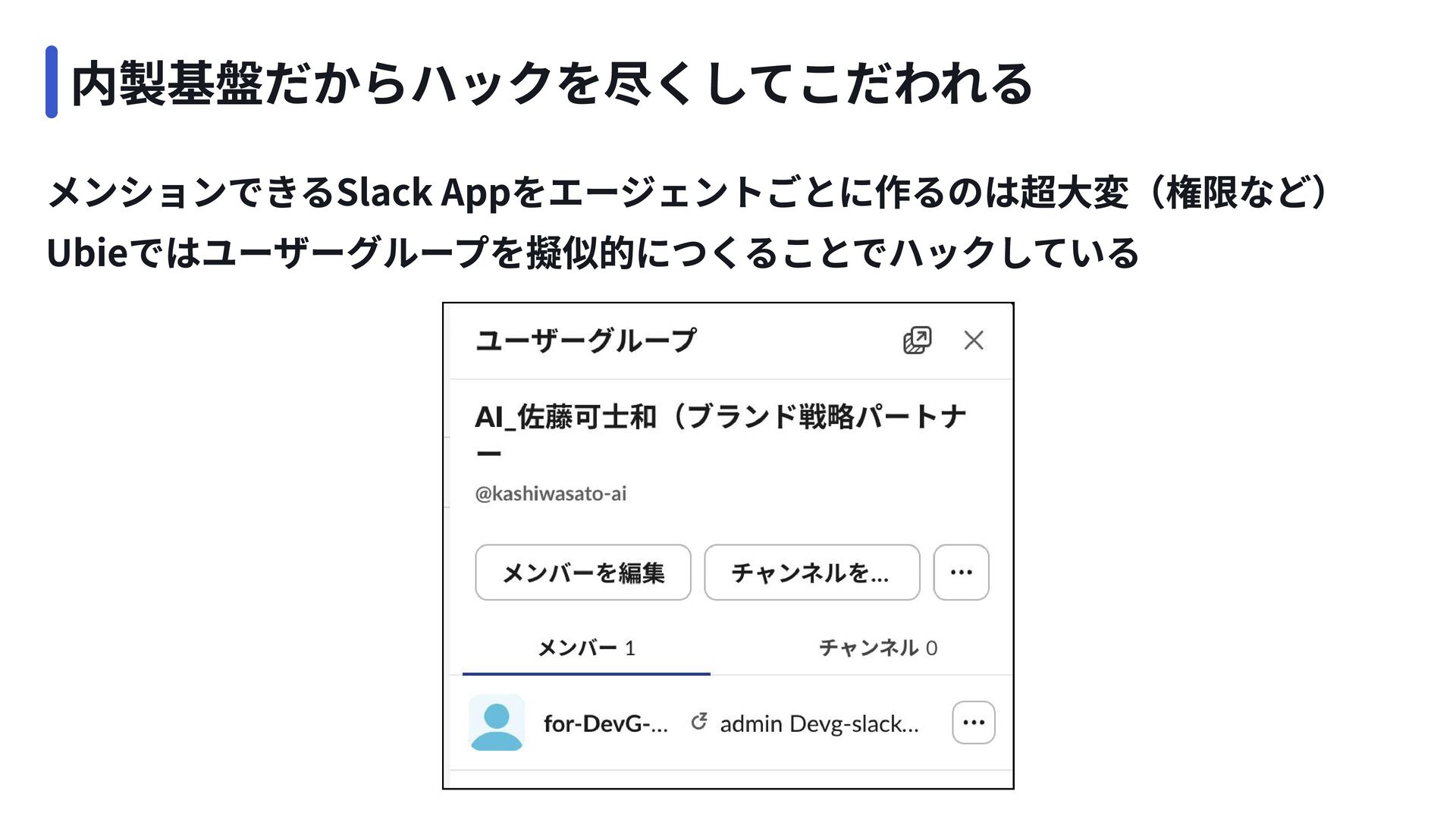 内製基盤だからハックを尽くしてこだわれる メンションできるSlack Appをエージェントごとに作るのは超大変(権限など) Ubieではユーザーグループを擬似的につくることでハックしている