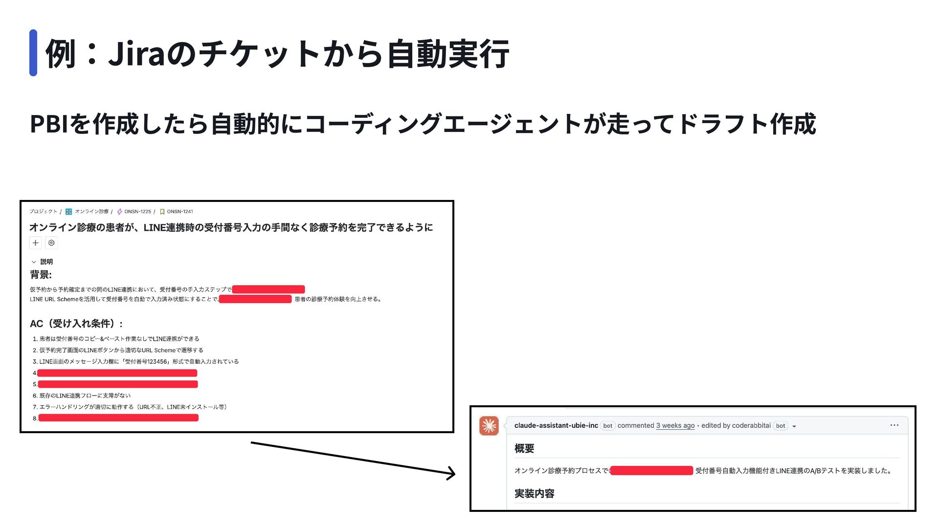 例:Jiraのチケットから自動実行 PBIを作成したら自動的にコーディングエージェントが走ってドラフト作成