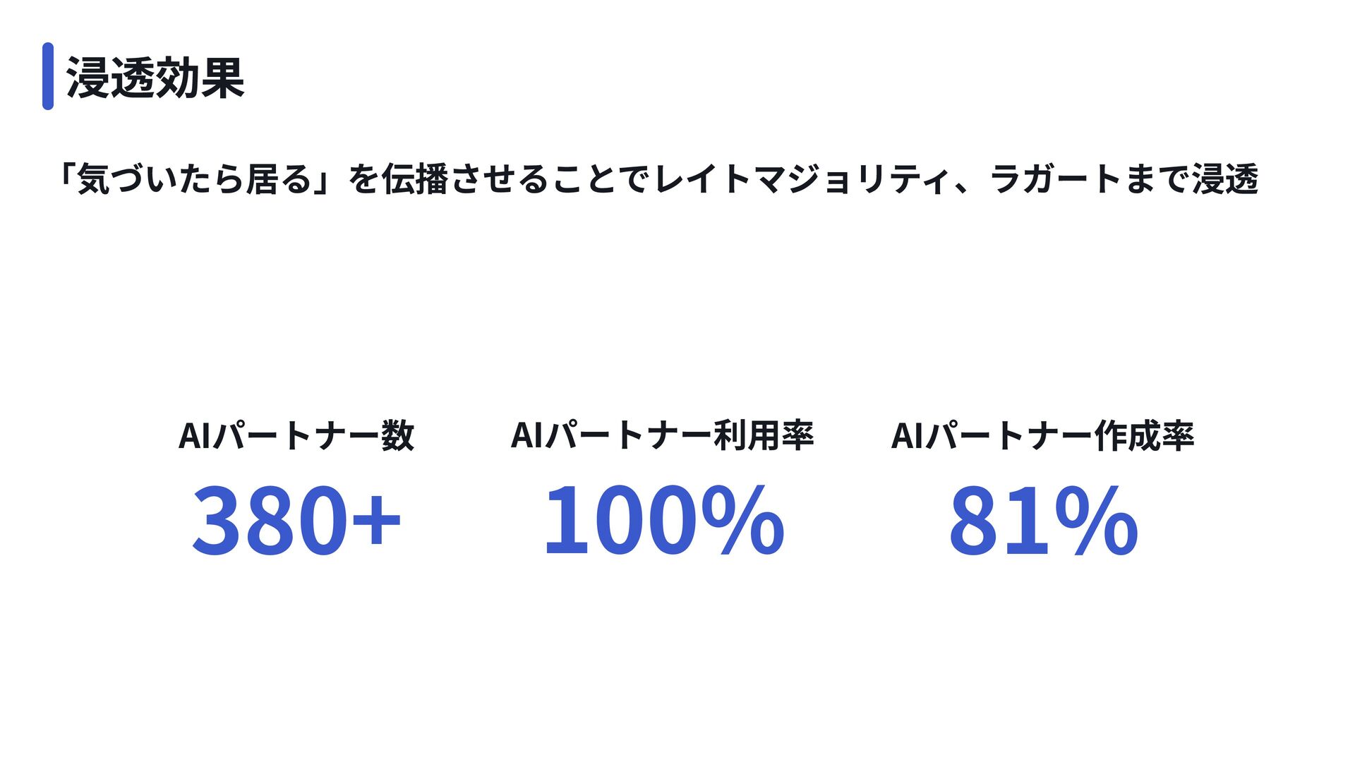 浸透効果 「気づいたら居る」を伝播させることでレイトマジョリティ、ラガートまで浸透 AIパートナー数 380+ AIパートナー利用率 100% AIパートナー作成率 81%