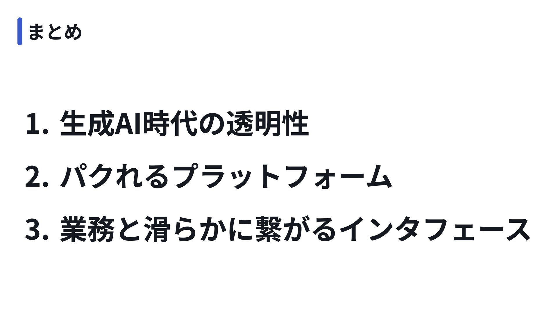 まとめ 生成AI時代の透明性 パクれるプラットフォーム 業務と滑らかに繋がるインタフェース