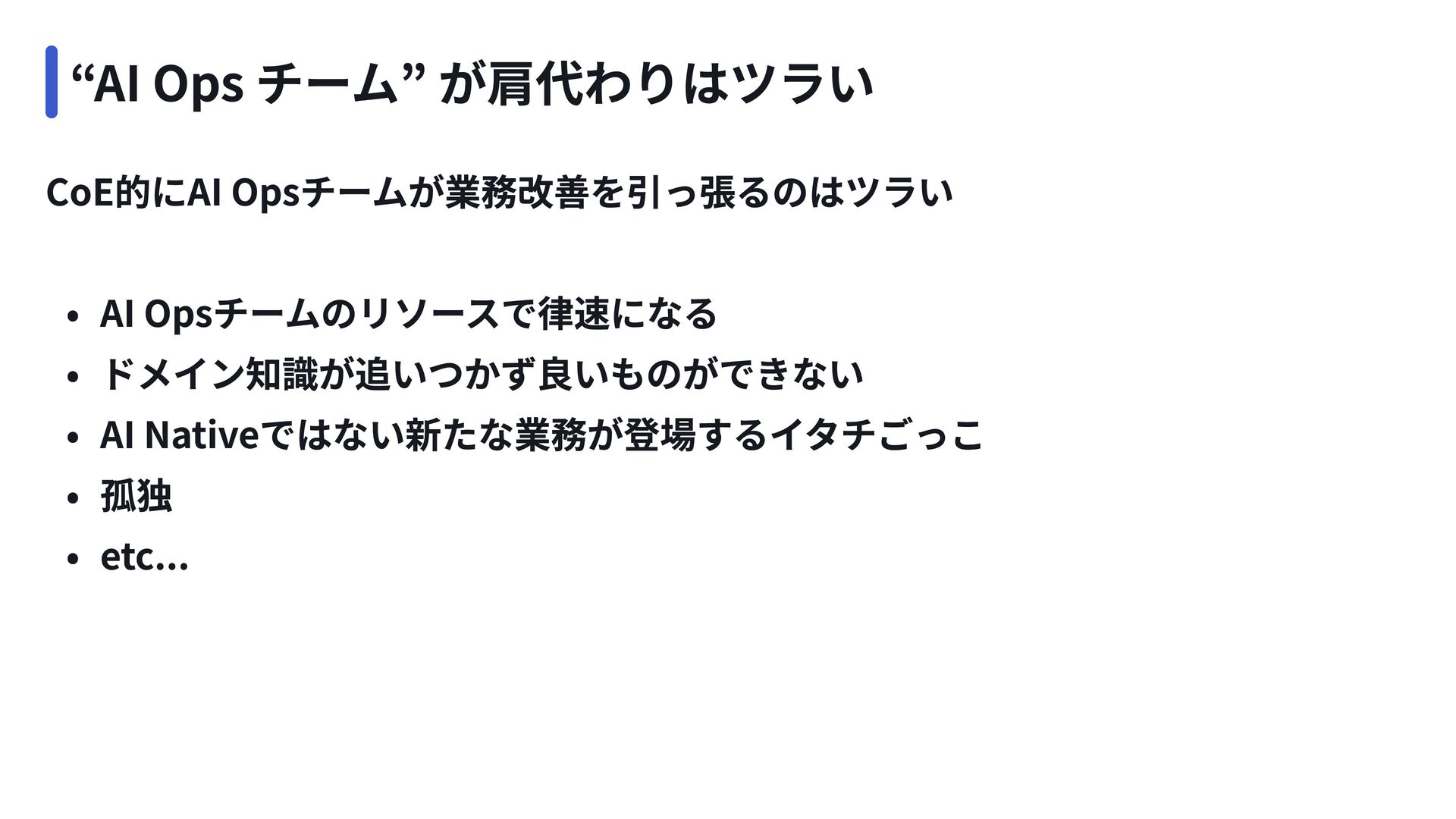 “AI Ops チーム” が肩代わりはツラい CoE的にAI Opsチームが業務改善を引っ張るのはツラい AI Opsチームのリソースで律速になる ドメイン知識が追いつかず良いものができない AI