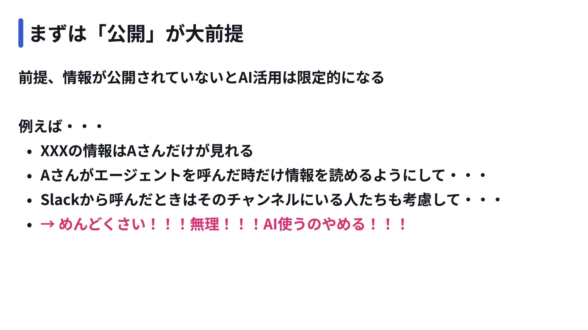 まずは「公開」が大前提 前提、情報が公開されていないとAI活用は限定的になる 例えば・・・ XXXの情報はAさんだけが見れる Aさんがエージェントを呼んだ時だけ情報を読めるようにして・・・ Slackから呼んだときはそのチャンネルにいる人たちも考慮して・・・ → めんどくさい!!!無理!!!AI使うのやめる!!!