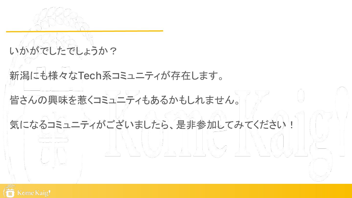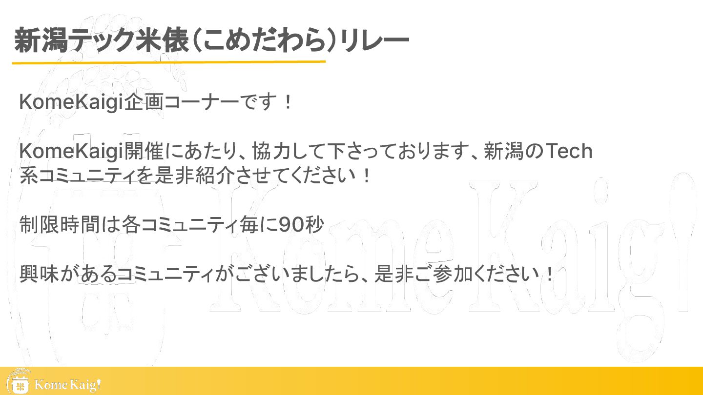 新潟テック米俵(こめだわら)リレー KomeKaigi企画コーナーです! KomeKaigi開催にあたり、協力して下さっております、新潟のTech 系コミュニティを是非紹介させてください! 制限時間は各コミュニティ毎に90秒 興味があるコミュニティがございましたら、是非ご参加ください!