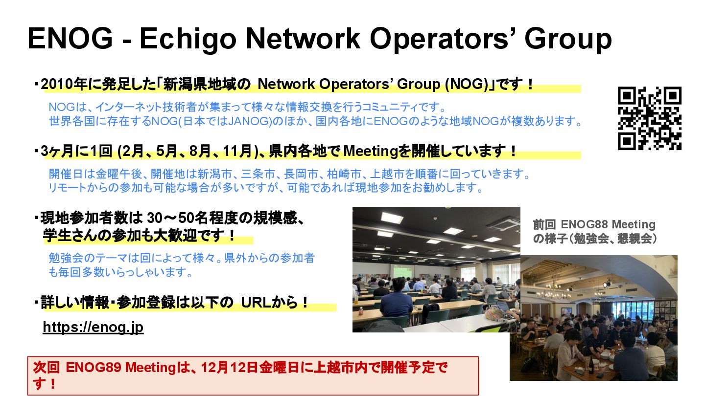 (NOG)」です! NOGは、インターネット技術者が集まって様々な情報交換を行うコミュニティです。 世界各国に存在するNOG(日本ではJANOG)のほか、国内各地にENOGのような地域NOGが複数あります。 ・3ヶ月に1回 (2月、5月、8月、11月)、県内各地で Meetingを開催しています! 開催日は金曜午後、開催地は新潟市、三条市、長岡市、柏崎市、上越市を順番に回っていきます。 リモートからの参加も可能な場合が多いですが、可能であれば現地参加をお勧めします。 ・現地参加者数は 30〜50名程度の規模感、 学生さんの参加も大歓迎です! 勉強会のテーマは回によって様々。県外からの参加者 も毎回多数いらっしゃいます。 ・詳しい情報・参加登録は以下の URLから! https://enog.jp 前回 ENOG88 Meeting の様子(勉強会、懇親会) 次回 ENOG89 Meetingは、12月12日金曜日に上越市内で開催予定で す!