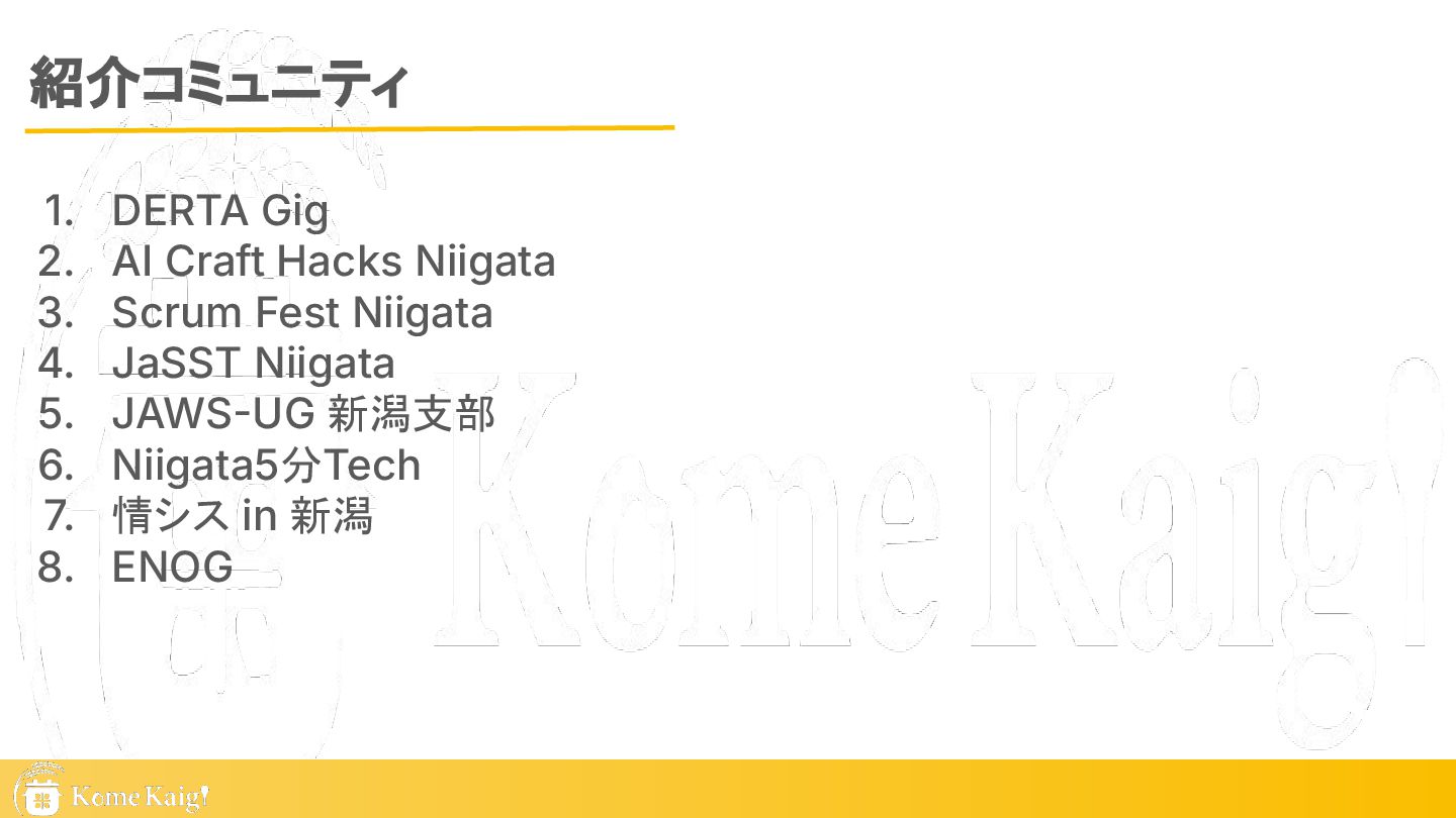 Scrum Fest Niigata 4. JaSST Niigata 5. JAWSUG 新潟支部 6. Niigata5分Tech 7. 情シス in 新潟 8. ENOG