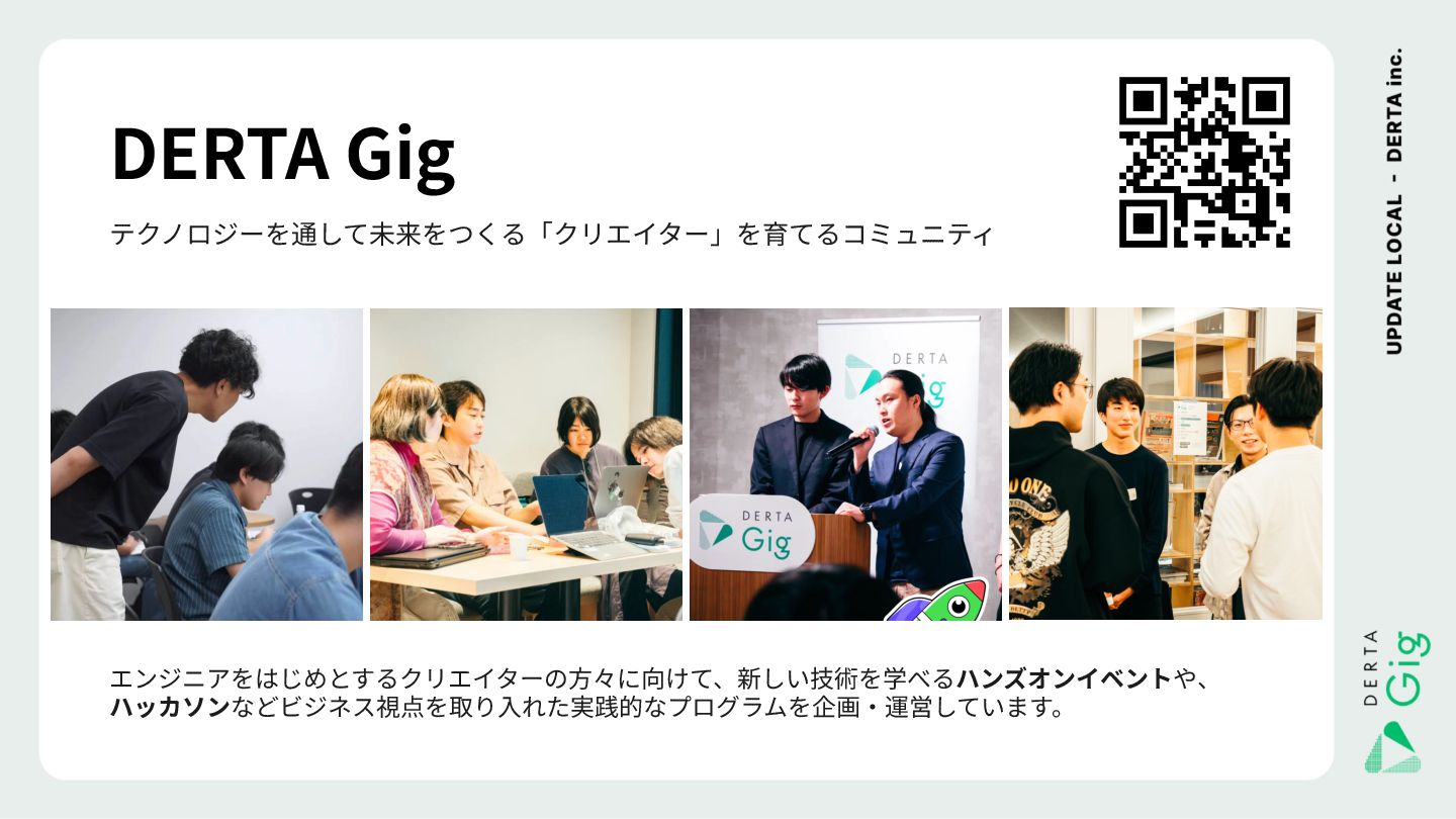 DERTA Gig テクノロジーを通して未来をつくる「クリエイター」を育てるコミュニティ エンジニアをはじめとするクリエイターの⽅々に向けて、新しい技術を学べるハンズオンイベントや、 ハッカソンなどビジネス視点を取り⼊れた実践的なプログラムを企画‧運営しています。