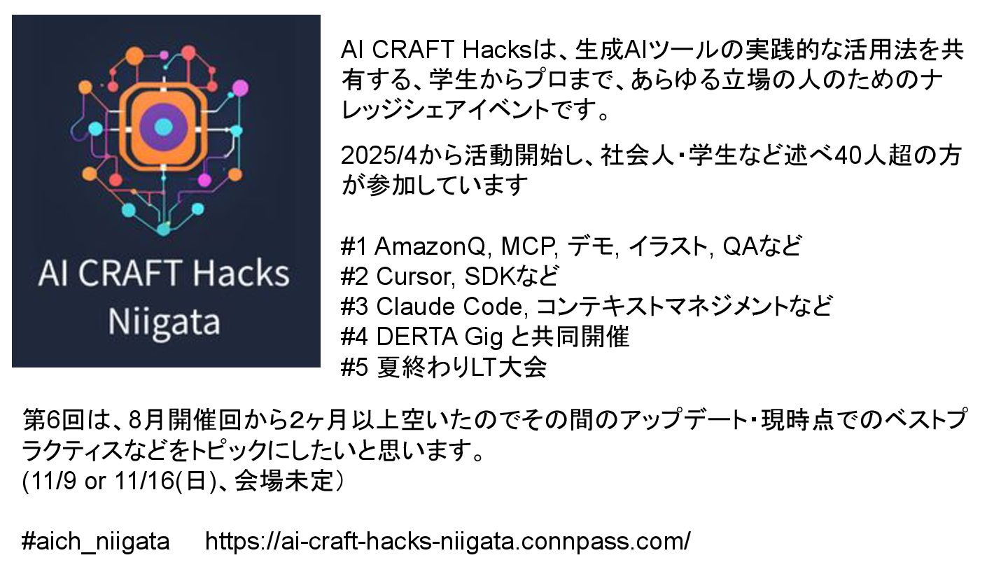 デモ, イラスト, QAなど #2 Cursor, SDKなど #3 Claude Code, コンテキストマネジメントなど #4 DERTA Gig と共同開催 #5 夏終わりLT大会 第6回は、8月開催回から2ヶ月以上空いたのでその間のアップデート・現時点でのベストプ ラクティスなどをトピックにしたいと思います。 (11/9 or 11/16(日)、会場未定) #aich_niigata https://ai-craft-hacks-niigata.connpass.com/