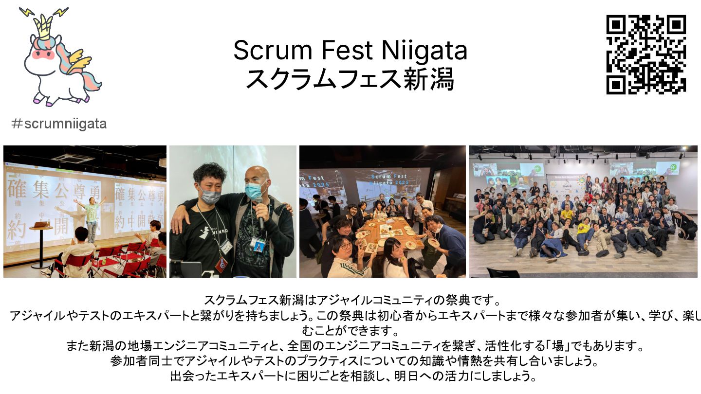 Scrum Fest Niigata スクラムフェス新潟 スクラムフェス新潟はアジャイルコミュニティの祭典です。 アジャイルやテストのエキスパートと繋がりを持ちましょう。この祭典は初心者からエキスパートまで様々な参加者が集い、学び、楽し むことができます。 また新潟の地場エンジニアコミュニティと、全国のエンジニアコミュニティを繋ぎ、活性化する「場」でもあります。 参加者同士でアジャイルやテストのプラクティスについての知識や情熱を共有し合いましょう。 出会ったエキスパートに困りごとを相談し、明日への活力にしましょう。