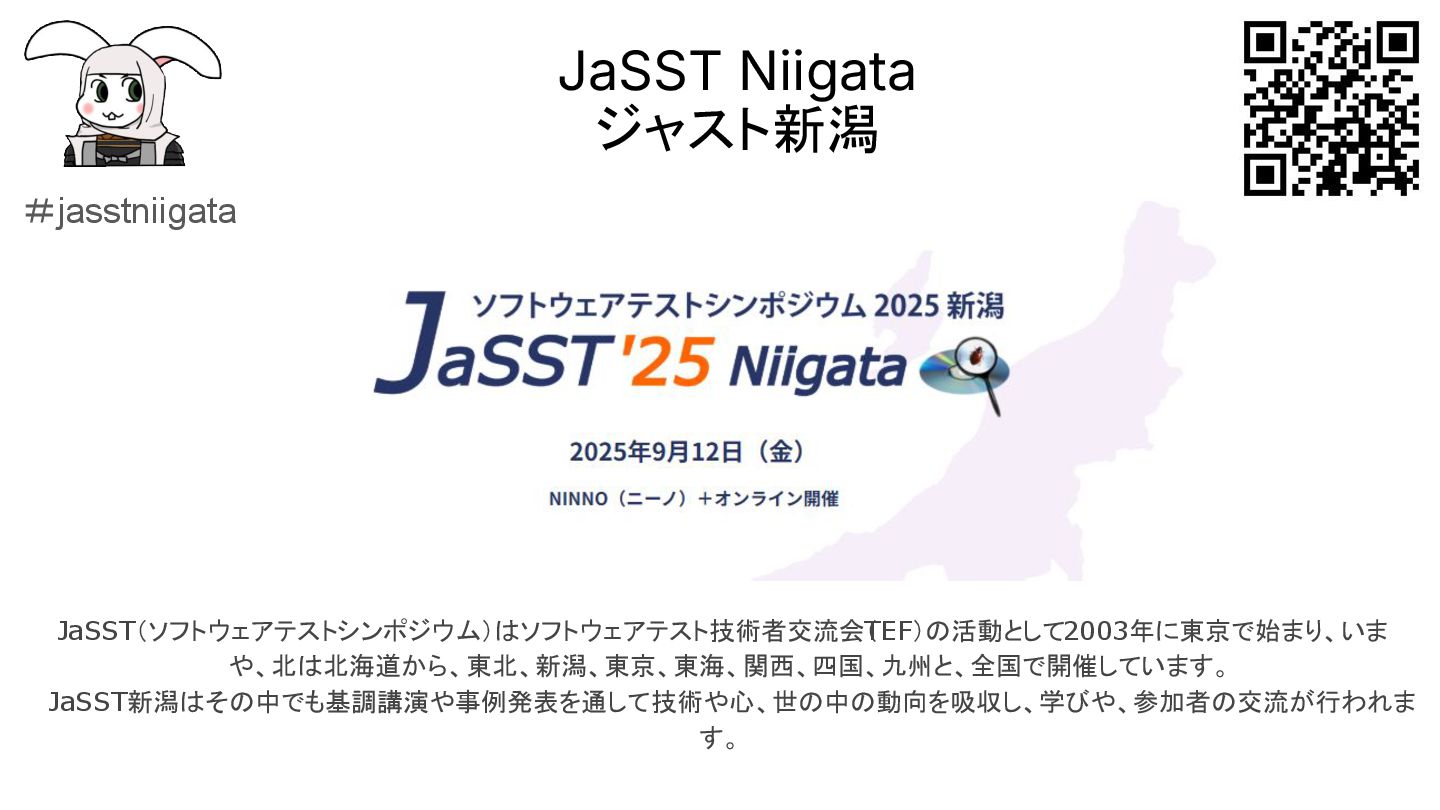 JaSST Niigata ジャスト新潟 JaSST(ソフトウェアテストシンポジウム)はソフトウェアテスト技術者交流会( TEF)の活動として2003年に東京で始まり、いま や、北は北海道から、東北、新潟、東京、東海、関西、四国、九州と、全国で開催しています。 JaSST新潟はその中でも基調講演や事例発表を通して技術や心、世の中の動向を吸収し、学びや、参加者の交流が行われま す。 #jasstniigata