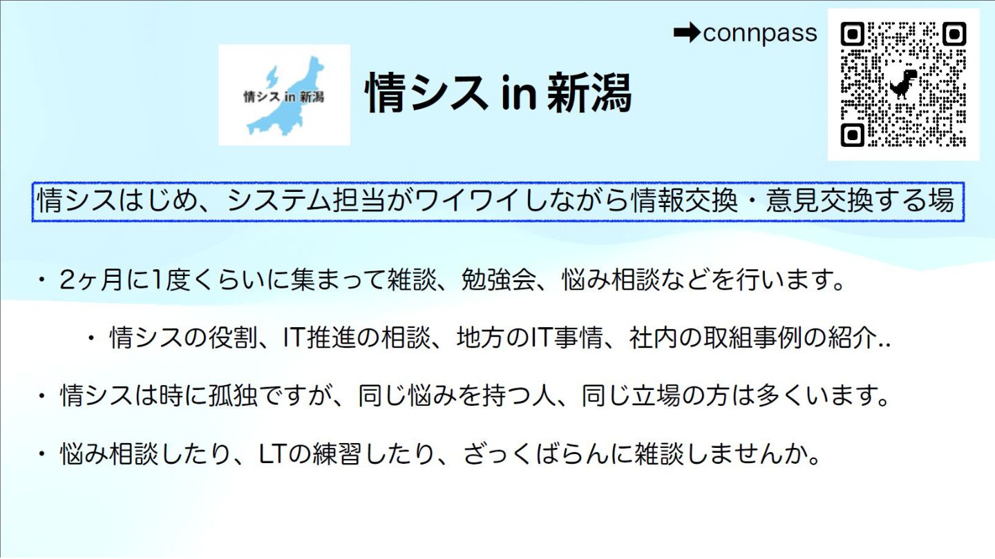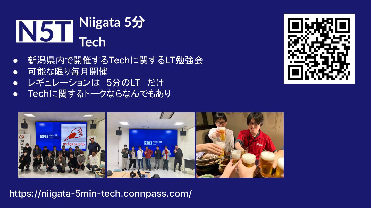 • 新潟県内で開催するTechに関するLT勉強会 • 可能な限り毎月開催 • レギュレーションは 5分のLT だけ • Techに関するトークならなんでもあり https://niigata-5min-tech.connpass.com/