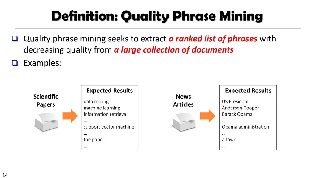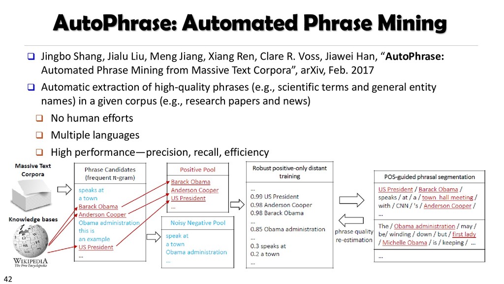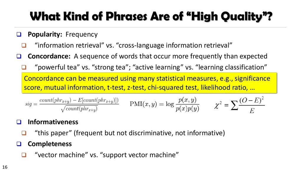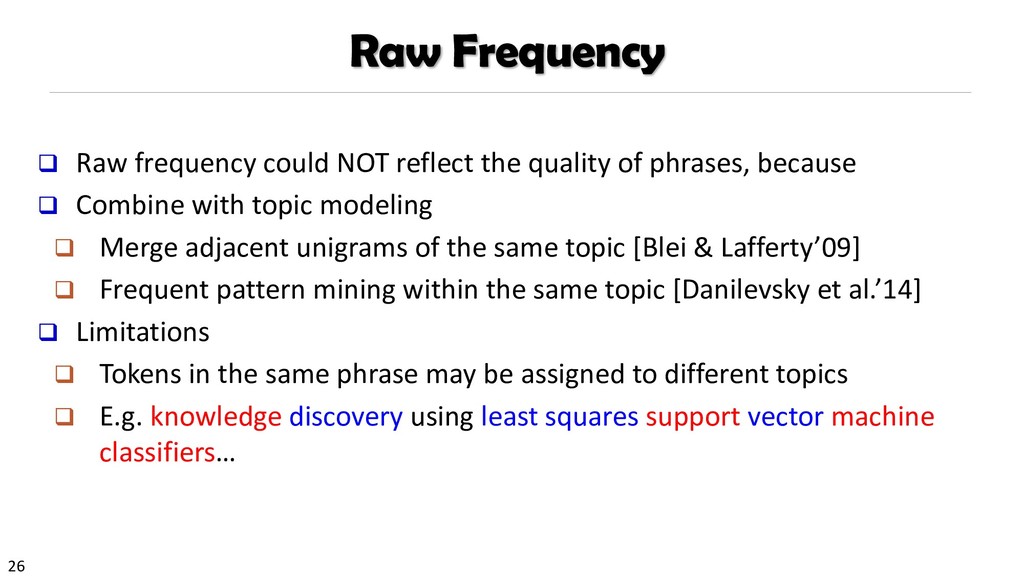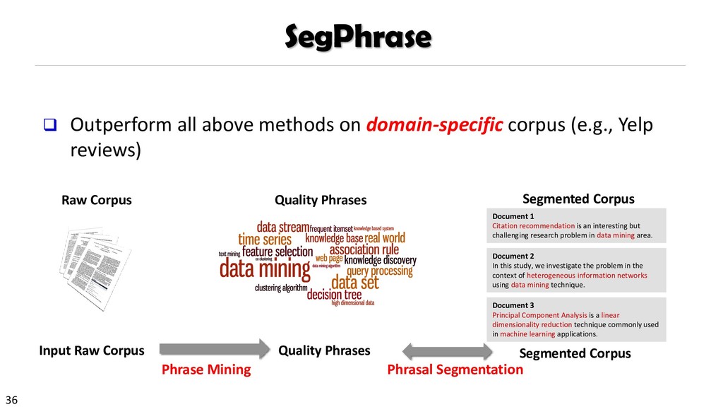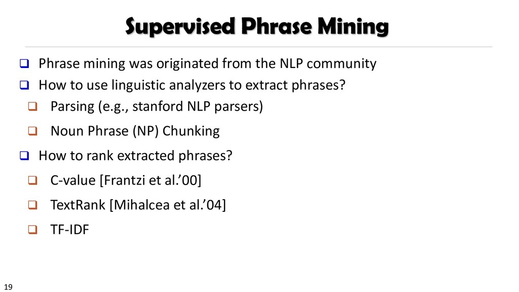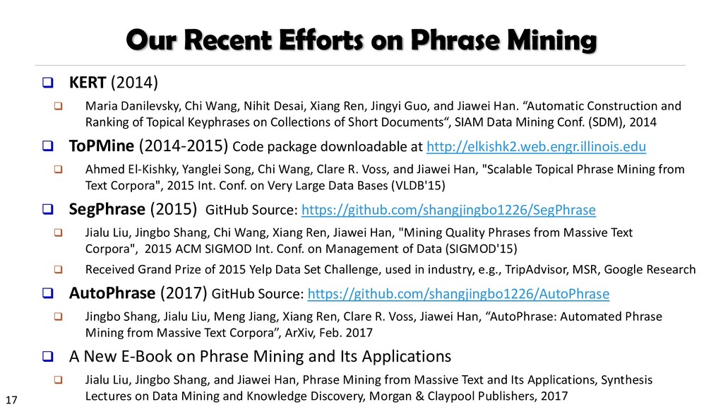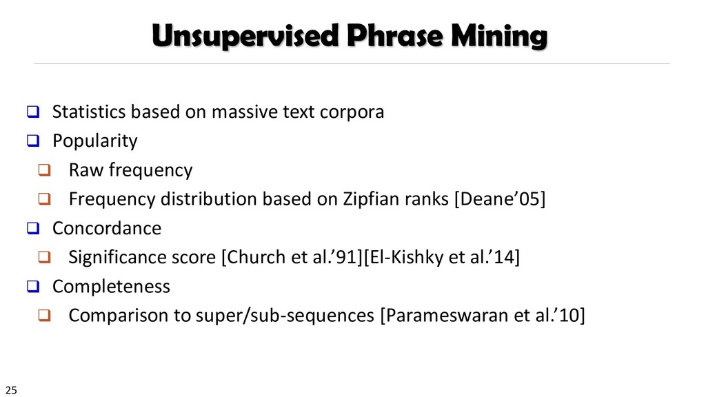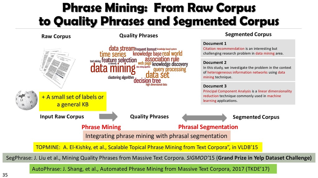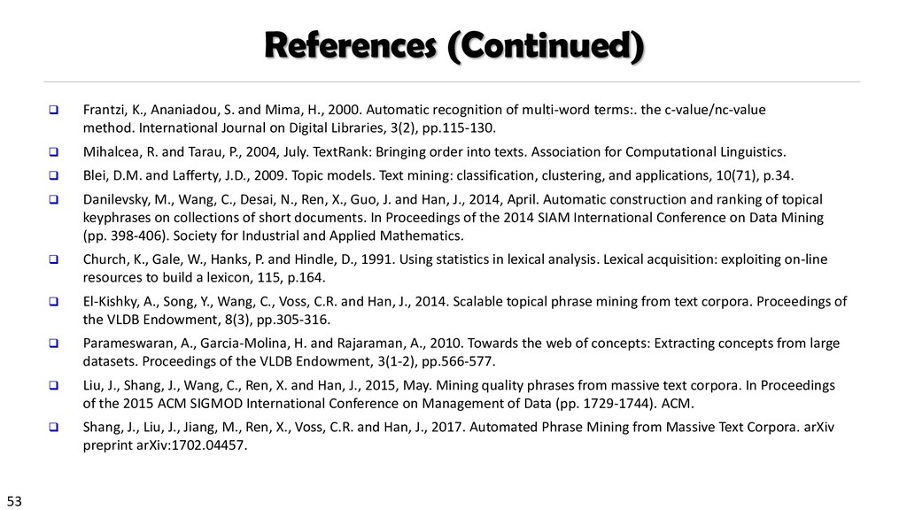 H., 2000. Automatic recognition of multi-word terms:. the c-value/nc-value method. International Journal on Digital Libraries, 3(2), pp.115-130. Mihalcea, R. and Tarau, P., 2004, July. TextRank: Bringing order into texts. Association for Computational Linguistics. Blei, D.M. and Lafferty, J.D., 2009. Topic models. Text mining: classification, clustering, and applications, 10(71), p.34. Danilevsky, M., Wang, C., Desai, N., Ren, X., Guo, J. and Han, J., 2014, April. Automatic construction and ranking of topical keyphrases on collections of short documents. In Proceedings of the 2014 SIAM International Conference on Data Mining (pp. 398-406). Society for Industrial and Applied Mathematics. Church, K., Gale, W., Hanks, P. and Hindle, D., 1991. Using statistics in lexical analysis. Lexical acquisition: exploiting on-line resources to build a lexicon, 115, p.164. El-Kishky, A., Song, Y., Wang, C., Voss, C.R. and Han, J., 2014. Scalable topical phrase mining from text corpora. Proceedings of the VLDB Endowment, 8(3), pp.305-316. Parameswaran, A., Garcia-Molina, H. and Rajaraman, A., 2010. Towards the web of concepts: Extracting concepts from large datasets. Proceedings of the VLDB Endowment, 3(1-2), pp.566-577. Liu, J., Shang, J., Wang, C., Ren, X. and Han, J., 2015, May. Mining quality phrases from massive text corpora. In Proceedings of the 2015 ACM SIGMOD International Conference on Management of Data (pp. 1729-1744). ACM. Shang, J., Liu, J., Jiang, M., Ren, X., Voss, C.R. and Han, J., 2017. Automated Phrase Mining from Massive Text Corpora. arXiv preprint arXiv:1702.04457.