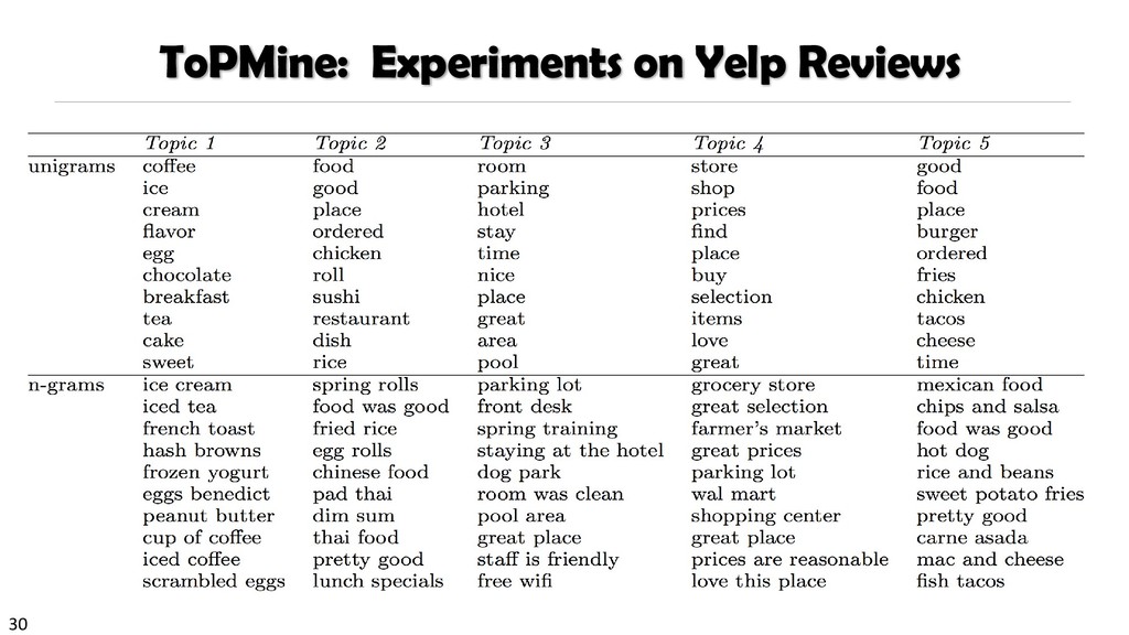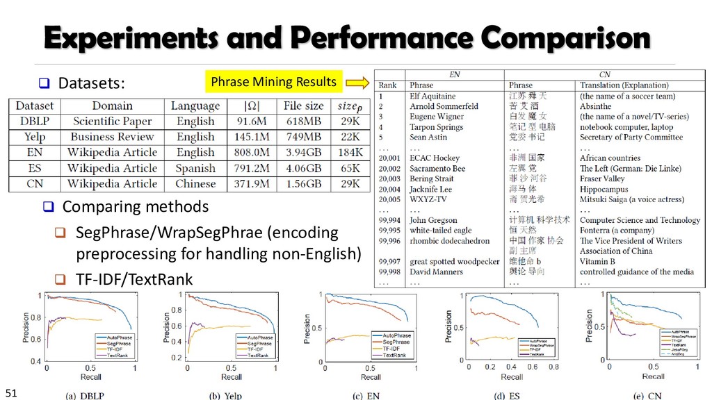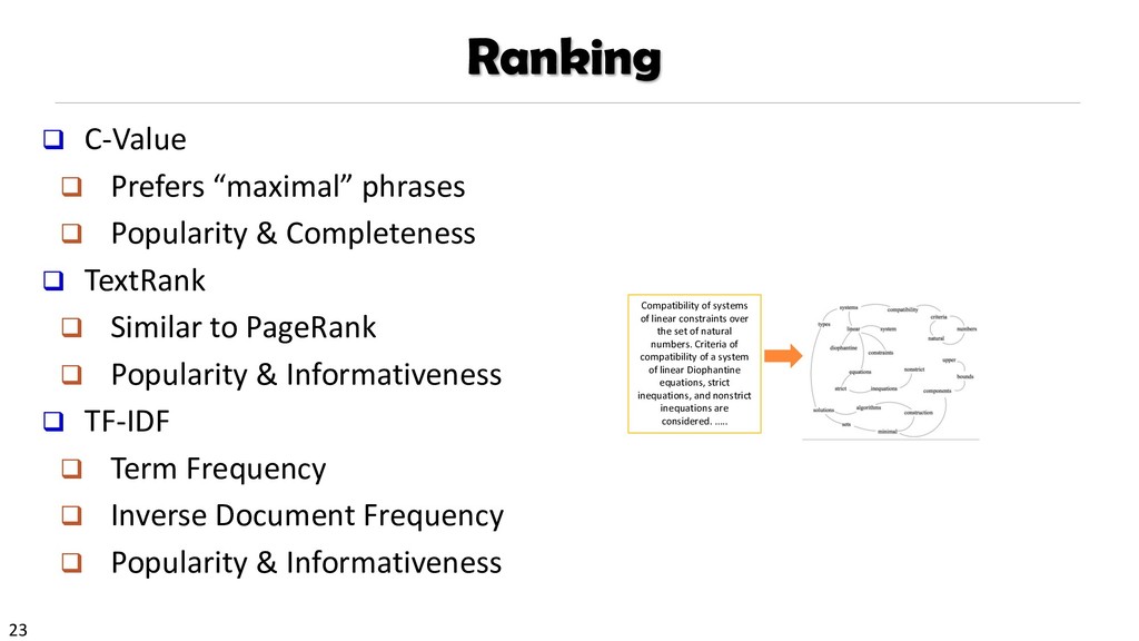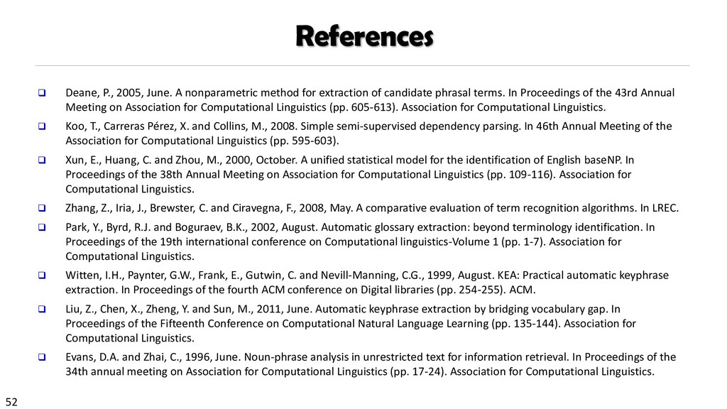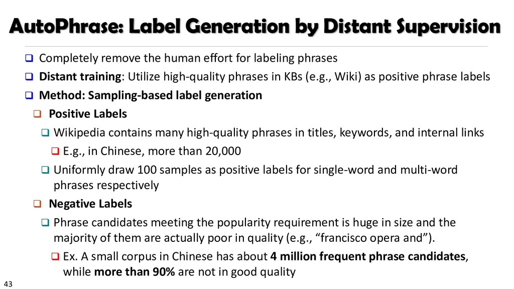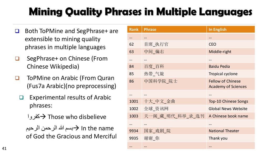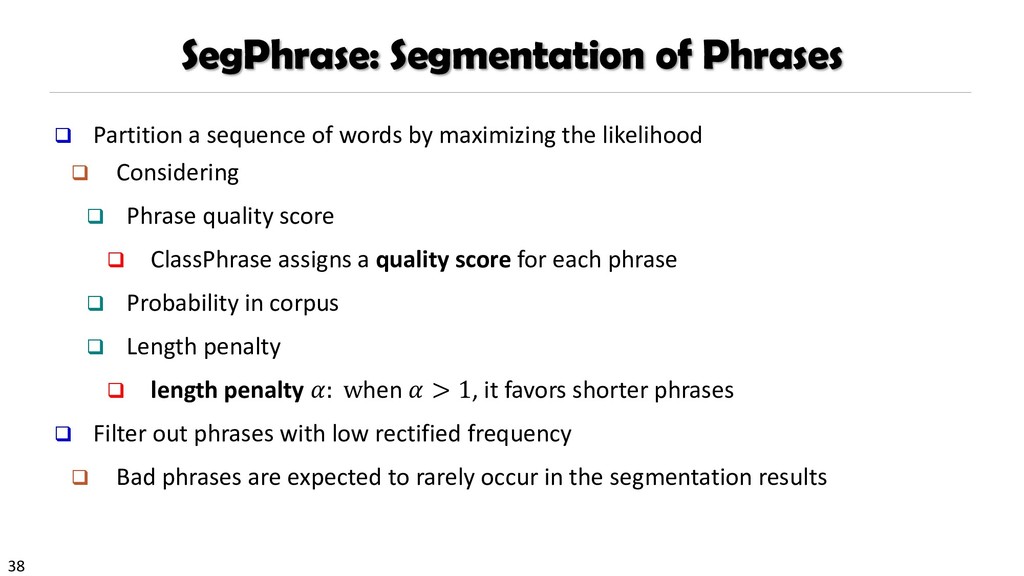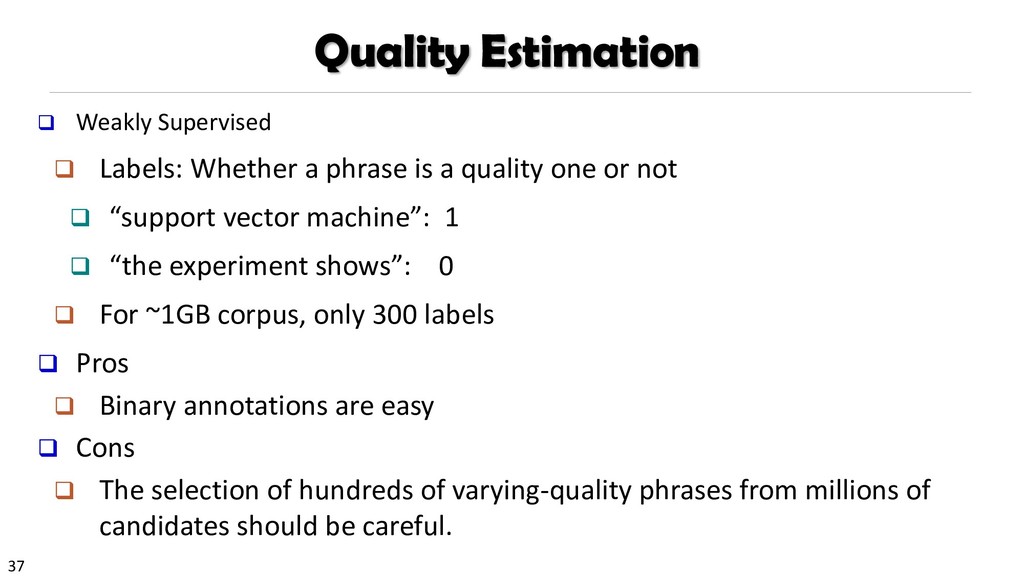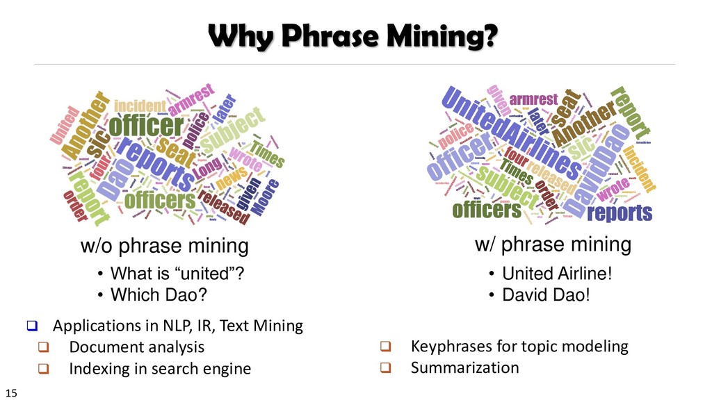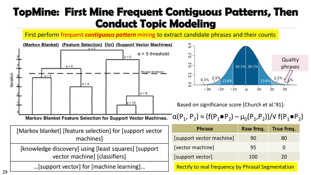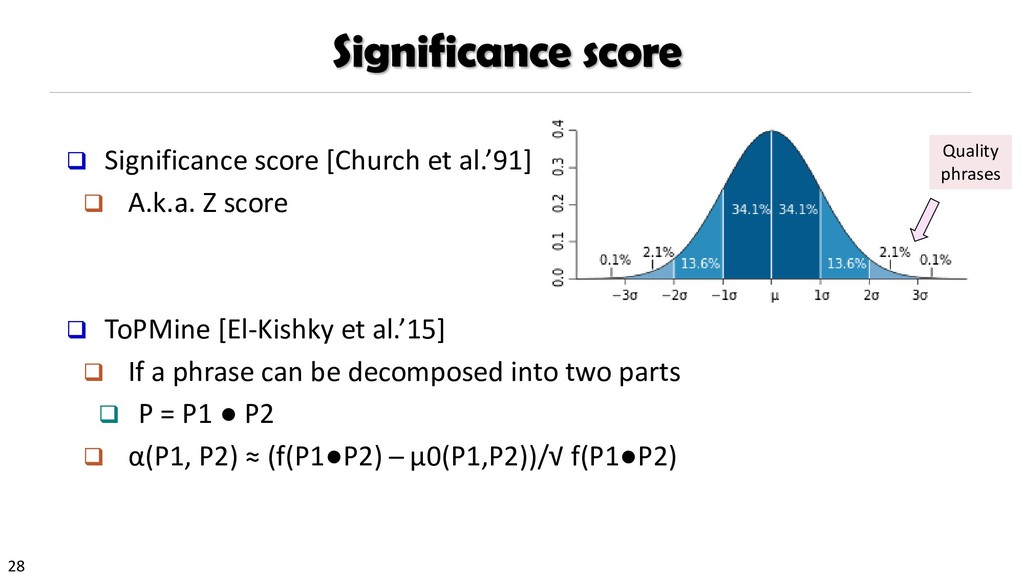 H., 2000. Automatic recognition of multi-word terms:. the c-value/nc-value method. International Journal on Digital Libraries, 3(2), pp.115-130. Mihalcea, R. and Tarau, P., 2004, July. TextRank: Bringing order into texts. Association for Computational Linguistics. Blei, D.M. and Lafferty, J.D., 2009. Topic models. Text mining: classification, clustering, and applications, 10(71), p.34. Danilevsky, M., Wang, C., Desai, N., Ren, X., Guo, J. and Han, J., 2014, April. Automatic construction and ranking of topical keyphrases on collections of short documents. In Proceedings of the 2014 SIAM International Conference on Data Mining (pp. 398-406). Society for Industrial and Applied Mathematics. Church, K., Gale, W., Hanks, P. and Hindle, D., 1991. Using statistics in lexical analysis. Lexical acquisition: exploiting on-line resources to build a lexicon, 115, p.164. El-Kishky, A., Song, Y., Wang, C., Voss, C.R. and Han, J., 2014. Scalable topical phrase mining from text corpora. Proceedings of the VLDB Endowment, 8(3), pp.305-316. Parameswaran, A., Garcia-Molina, H. and Rajaraman, A., 2010. Towards the web of concepts: Extracting concepts from large datasets. Proceedings of the VLDB Endowment, 3(1-2), pp.566-577. Liu, J., Shang, J., Wang, C., Ren, X. and Han, J., 2015, May. Mining quality phrases from massive text corpora. In Proceedings of the 2015 ACM SIGMOD International Conference on Management of Data (pp. 1729-1744). ACM. Shang, J., Liu, J., Jiang, M., Ren, X., Voss, C.R. and Han, J., 2017. Automated Phrase Mining from Massive Text Corpora. arXiv preprint arXiv:1702.04457.