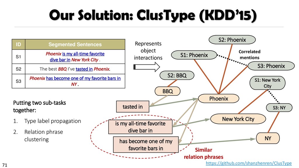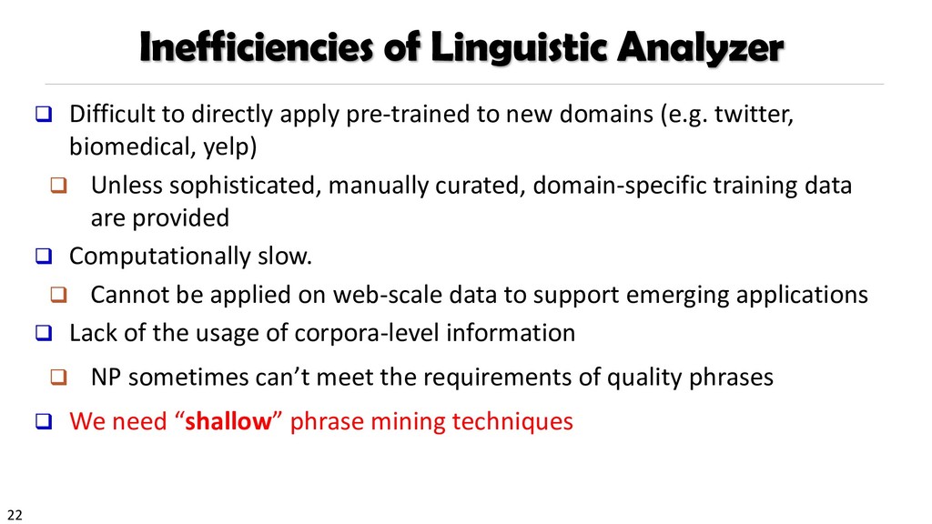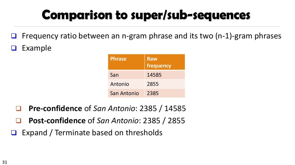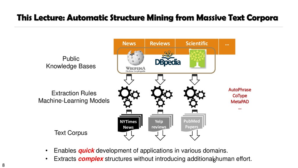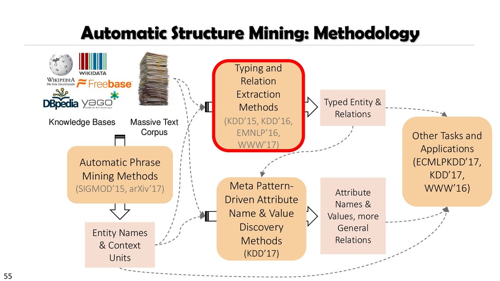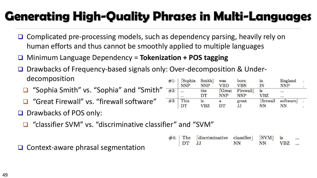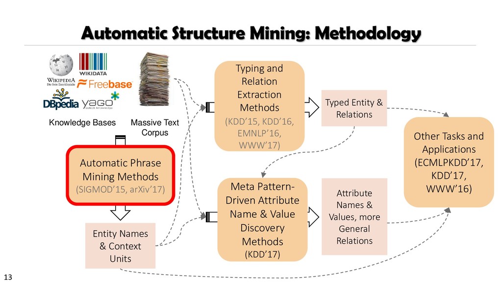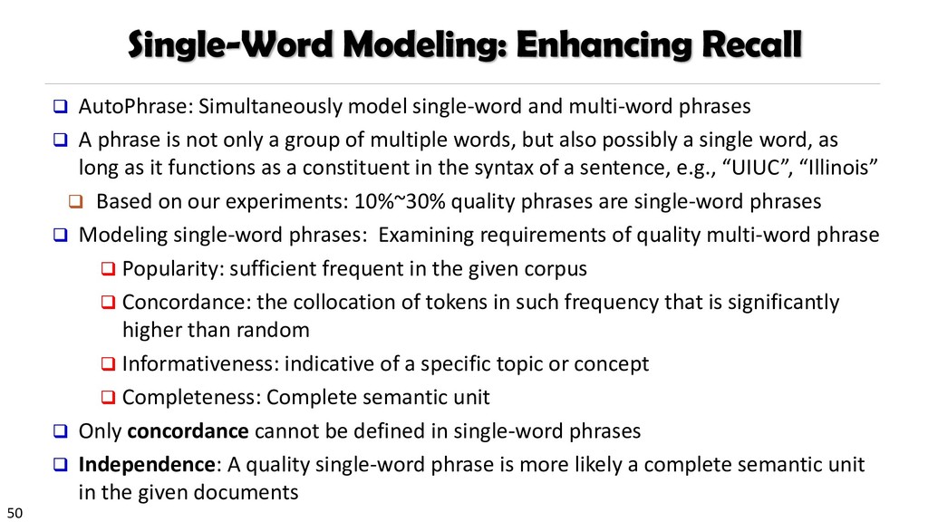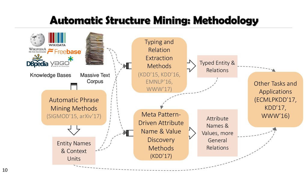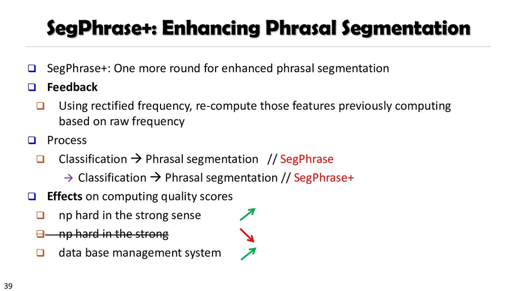 H., 2000. Automatic recognition of multi-word terms:. the c-value/nc-value method. International Journal on Digital Libraries, 3(2), pp.115-130. Mihalcea, R. and Tarau, P., 2004, July. TextRank: Bringing order into texts. Association for Computational Linguistics. Blei, D.M. and Lafferty, J.D., 2009. Topic models. Text mining: classification, clustering, and applications, 10(71), p.34. Danilevsky, M., Wang, C., Desai, N., Ren, X., Guo, J. and Han, J., 2014, April. Automatic construction and ranking of topical keyphrases on collections of short documents. In Proceedings of the 2014 SIAM International Conference on Data Mining (pp. 398-406). Society for Industrial and Applied Mathematics. Church, K., Gale, W., Hanks, P. and Hindle, D., 1991. Using statistics in lexical analysis. Lexical acquisition: exploiting on-line resources to build a lexicon, 115, p.164. El-Kishky, A., Song, Y., Wang, C., Voss, C.R. and Han, J., 2014. Scalable topical phrase mining from text corpora. Proceedings of the VLDB Endowment, 8(3), pp.305-316. Parameswaran, A., Garcia-Molina, H. and Rajaraman, A., 2010. Towards the web of concepts: Extracting concepts from large datasets. Proceedings of the VLDB Endowment, 3(1-2), pp.566-577. Liu, J., Shang, J., Wang, C., Ren, X. and Han, J., 2015, May. Mining quality phrases from massive text corpora. In Proceedings of the 2015 ACM SIGMOD International Conference on Management of Data (pp. 1729-1744). ACM. Shang, J., Liu, J., Jiang, M., Ren, X., Voss, C.R. and Han, J., 2017. Automated Phrase Mining from Massive Text Corpora. arXiv preprint arXiv:1702.04457.