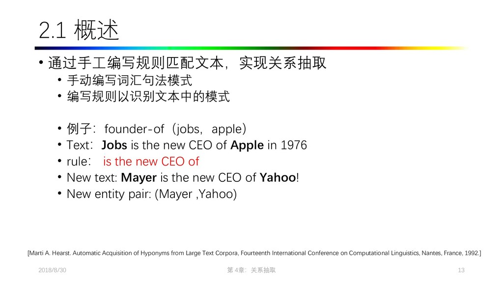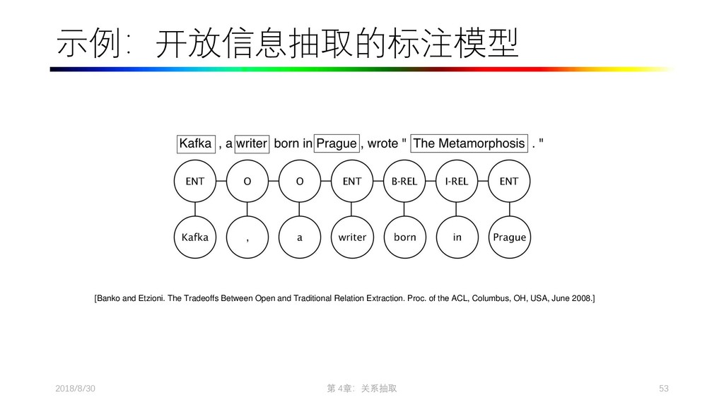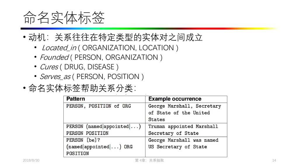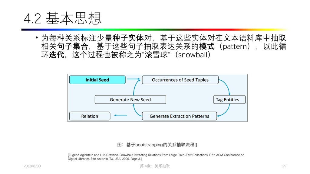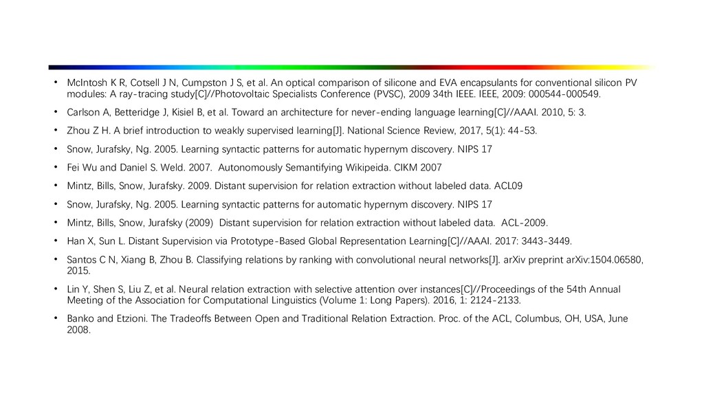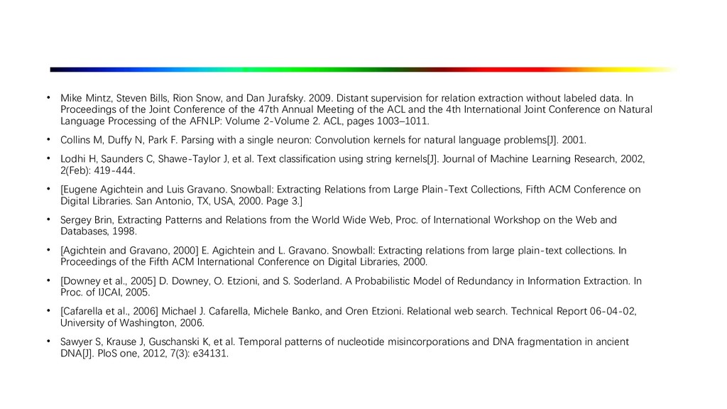 2009. Distant supervision for relation extraction without labeled data. In Proceedings of the Joint Conference of the 47th Annual Meeting of the ACL and the 4th International Joint Conference on Natural Language Processing of the AFNLP: Volume 2-Volume 2. ACL, pages 1003–1011. • Collins M, Duffy N, Park F. Parsing with a single neuron: Convolution kernels for natural language problems[J]. 2001. • Lodhi H, Saunders C, Shawe-Taylor J, et al. Text classification using string kernels[J]. Journal of Machine Learning Research, 2002, 2(Feb): 419-444. • [Eugene Agichtein and Luis Gravano. Snowball: Extracting Relations from Large Plain-Text Collections, Fifth ACM Conference on Digital Libraries. San Antonio, TX, USA, 2000. Page 3.] • Sergey Brin, Extracting Patterns and Relations from the World Wide Web, Proc. of International Workshop on the Web and Databases, 1998. • [Agichtein and Gravano, 2000] E. Agichtein and L. Gravano. Snowball: Extracting relations from large plain-text collections. In Proceedings of the Fifth ACM International Conference on Digital Libraries, 2000. • [Downey et al., 2005] D. Downey, O. Etzioni, and S. Soderland. A Probabilistic Model of Redundancy in Information Extraction. In Proc. of IJCAI, 2005. • [Cafarella et al., 2006] Michael J. Cafarella, Michele Banko, and Oren Etzioni. Relational web search. Technical Report 06-04-02, University of Washington, 2006. • Sawyer S, Krause J, Guschanski K, et al. Temporal patterns of nucleotide misincorporations and DNA fragmentation in ancient DNA[J]. PloS one, 2012, 7(3): e34131.