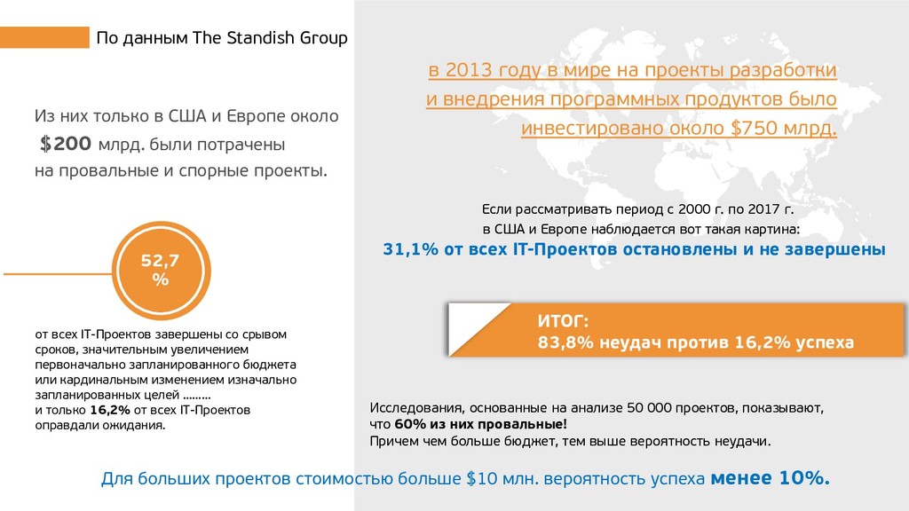 программных продуктов было инвестировано около $750 млрд. Исследования, основанные на анализе 50 000 проектов, показывают, что 60% из них провальные! Причем чем больше бюджет, тем выше вероятность неудачи. Для больших проектов стоимостью больше $10 млн. вероятность успеха менее 10%. По данным The Standish Group 52,7 % ИТОГ: 83,8% неудач против 16,2% успеха Из них только в США и Европе около $200 млрд. были потрачены на провальные и спорные проекты. Если рассматривать период с 2000 г. по 2017 г. в США и Европе наблюдается вот такая картина: 31,1% от всех IT-Проектов остановлены и не завершены от всех IT-Проектов завершены со срывом сроков, значительным увеличением первоначально запланированного бюджета или кардинальным изменением изначально запланированных целей ……… и только 16,2% от всех IT-Проектов оправдали ожидания.