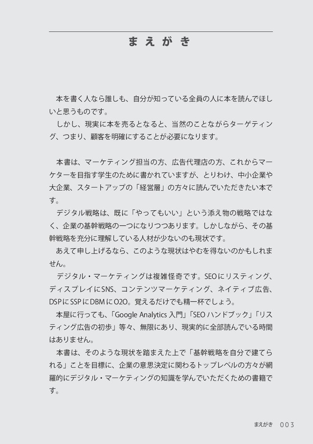 ァ ンディ ングの流行 本章では、 「プレ・マーケティング」という概念を提唱します。プレ・ マーケティングとは、実際に製品を開発し、販売する前に行うべきマー ケティングです。 たとえば、Webサイトの公開前に、TwitterのフォロワーやFacebook ページのいいね数、メールマガジンの購読数が一定数あれば、最初の反 応が変わってくるでしょう。 スマートフォンの普及により、顧客とつながる方法が多様化している ことも見逃せません。 このように、製品やサービスの公開前に顧客とつながることは、様々 な好影響を、製品やサービスにもたらします。 2016年11月、戦時中の広島県呉の生活を描いた長編アニメーション 映画『この世界の片隅に』が公開されました。 この映画は公開から1年半以上経った今でも(18年8月現在) 、劇場 で上映されており、異例のロングランです。18年に入って、興業収入が 27億円を超えたと言われています。 公開当初はわずか63館での上映でしたが、観客の口コミによって評 判が徐々に広まり、結果、映画館での上映は400館を超えました。 実はこの映画、他の映画とは違う画期的な点が1つあります。それ は、クラウドファンディング(不特定多数による、リターンを前提とし こ こでは、事業を立ち上げる前にマーケティ ングをはじめるこ とを提 案します。リーンスタートアップやクラウ ドファンディ ングなど トレン ドの手法を使いながら、 「いかにリスクは少なく マーケティ ングを行 うか」を提案します。 プレ・マーケテ ィ ングの時代 1-2 0 2 9 part1 ϓ Ϩ ɾ Ϛ ồ έ ς ỹ ϯ ά ỳ ͯ Կ ʁ Ổ Ϛ ồ έ ς ỹ ϯ ά ͔ Β ͡ Ί Α ͏ プレ ・ マーケテ ィ ングの時代 1-2