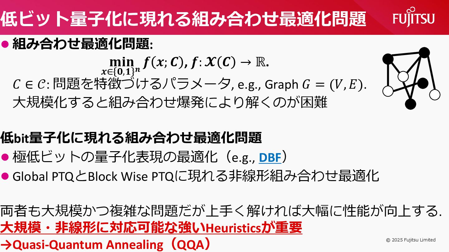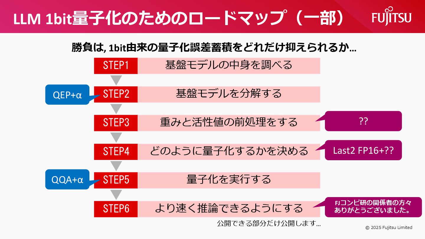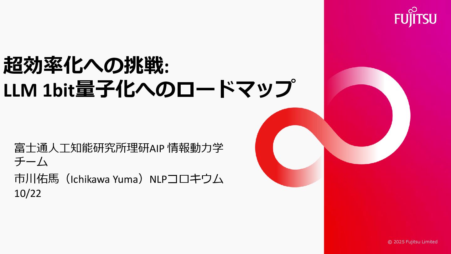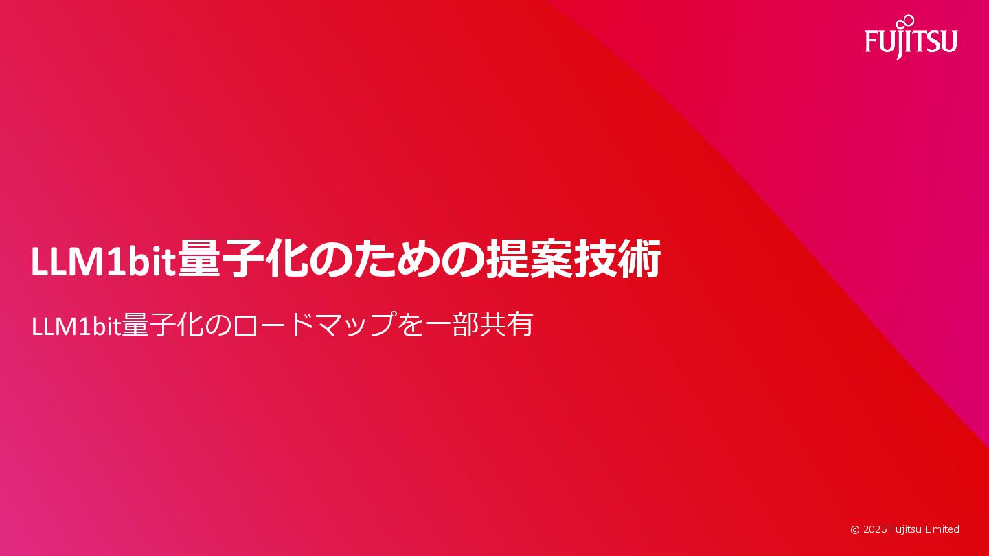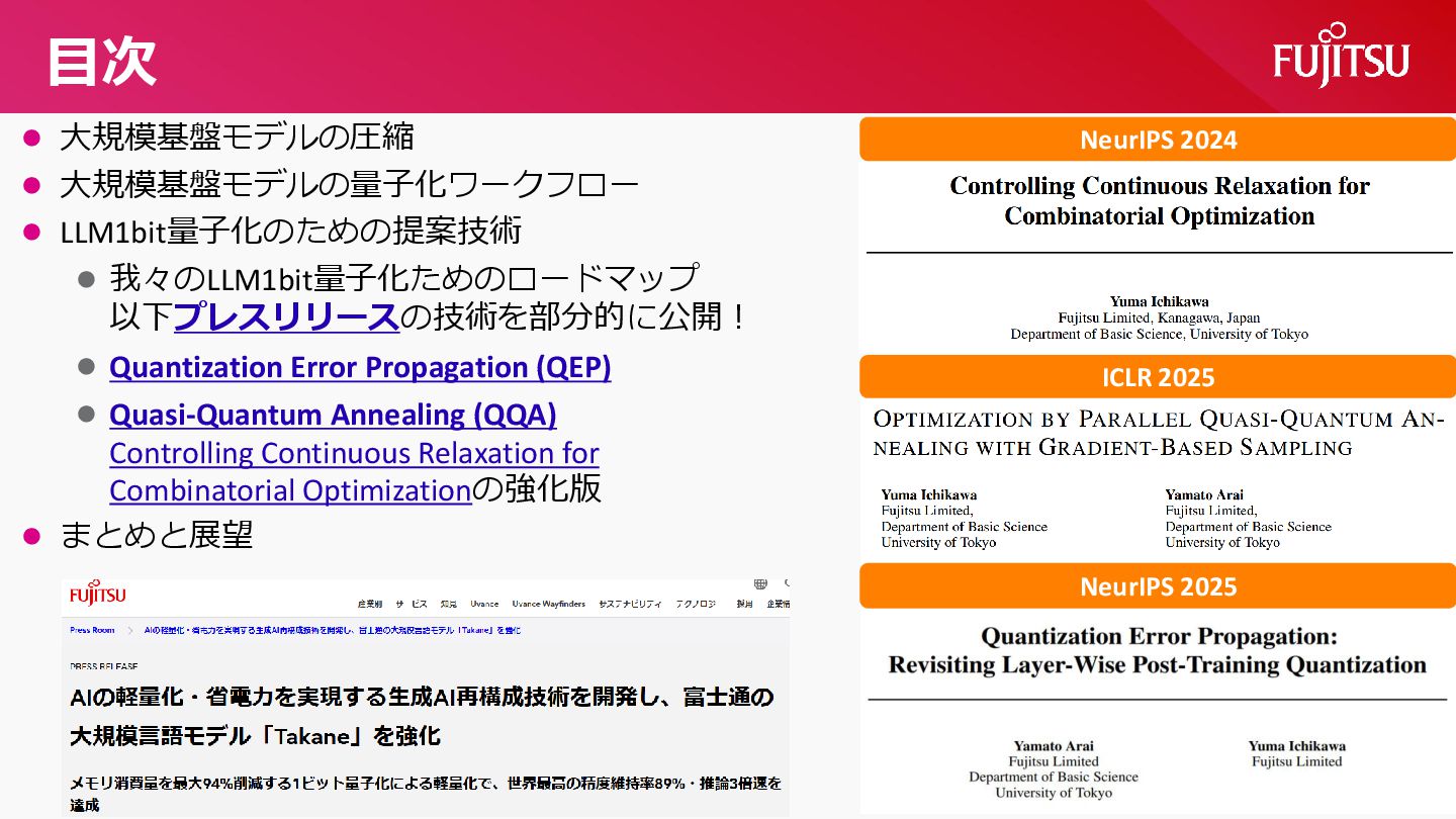 近年, LLM(Large Language Model)の大規模化に伴い, 推論速度の低下, メモリ使用量の増大, および電力コストの上昇といった課題が顕在化している. これらの課題に対処するため, 実数表現を離散化し計算効率を向上させる量子化技術が注目されている. しかし, LLMの量子化において, 極低ビット量子化の実現は困難であることが報告されている. 我々はこの課題に挑戦し, 1bitの極低ビット量子化であっても標準ベンチマーク上で平均90%の性能を維持することに成功した. その成果は, 最近のプレスリリースにて報告している. 本講演では, この成果に至るまでの研究ロードマップを示すとともにLLM量子化のワークフローおよび最新動向を体系的に概観する. さらに, 我々が開発した独自技術である量子化誤差伝搬(Quantization Error Propagation: QEP)および疑似量子アニーリング(Quasi-Quantum Annealing: QQA)の設計思想とその効果を簡単に説明する. そして, 最後に1bit量子化の先にある持続可能な推論基盤への展望を提示する.