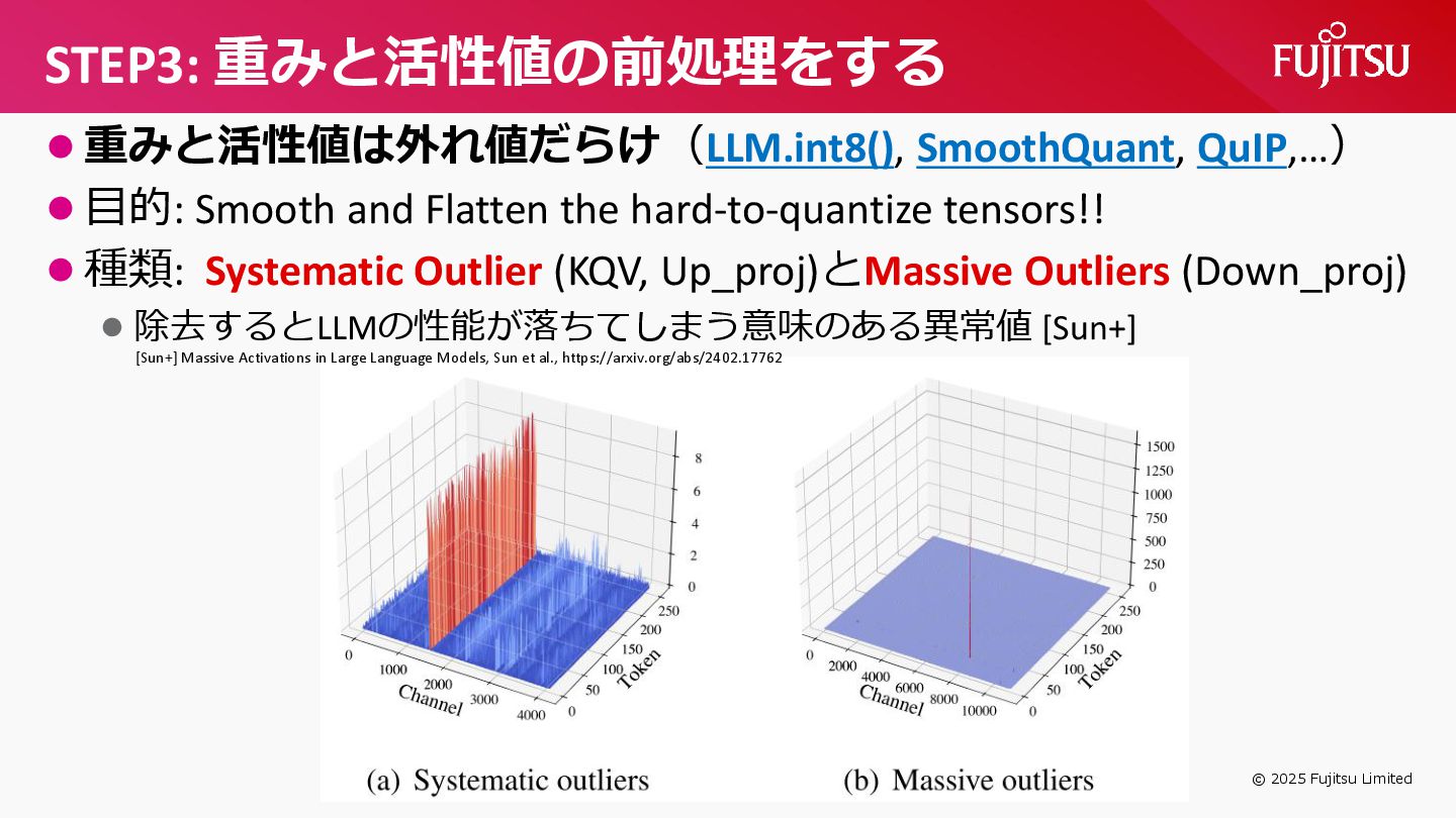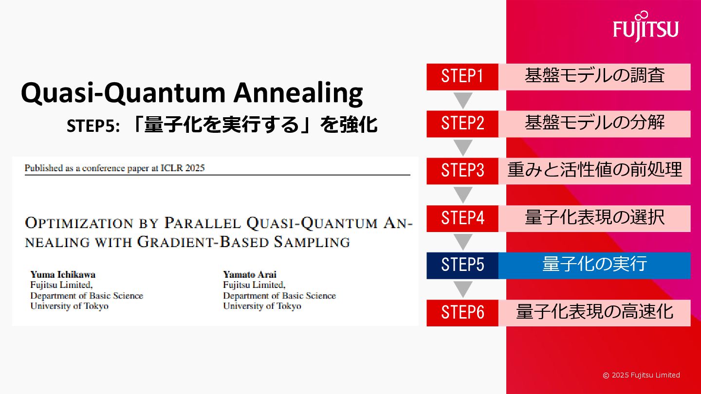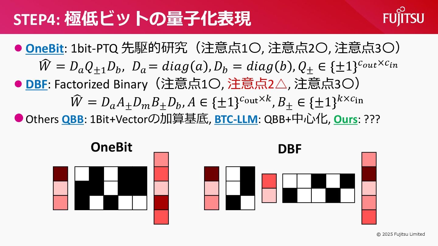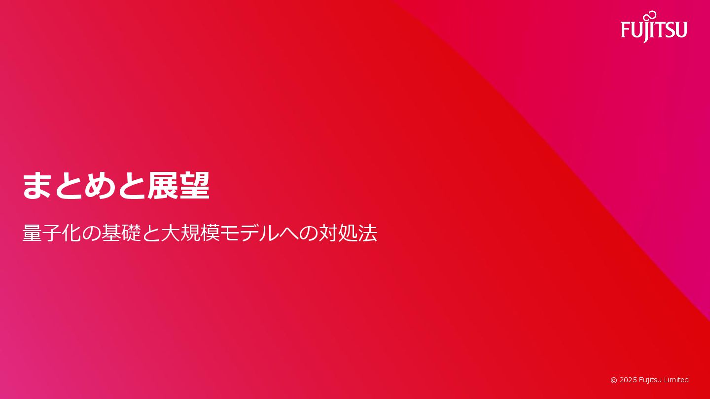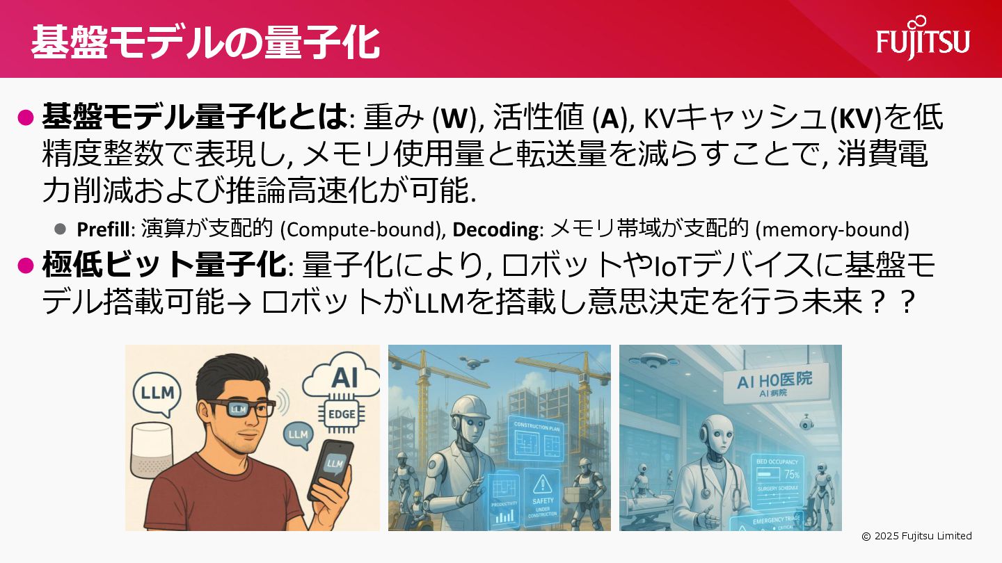 近年, LLM(Large Language Model)の大規模化に伴い, 推論速度の低下, メモリ使用量の増大, および電力コストの上昇といった課題が顕在化している. これらの課題に対処するため, 実数表現を離散化し計算効率を向上させる量子化技術が注目されている. しかし, LLMの量子化において, 極低ビット量子化の実現は困難であることが報告されている. 我々はこの課題に挑戦し, 1bitの極低ビット量子化であっても標準ベンチマーク上で平均90%の性能を維持することに成功した. その成果は, 最近のプレスリリースにて報告している. 本講演では, この成果に至るまでの研究ロードマップを示すとともにLLM量子化のワークフローおよび最新動向を体系的に概観する. さらに, 我々が開発した独自技術である量子化誤差伝搬(Quantization Error Propagation: QEP)および疑似量子アニーリング(Quasi-Quantum Annealing: QQA)の設計思想とその効果を簡単に説明する. そして, 最後に1bit量子化の先にある持続可能な推論基盤への展望を提示する.