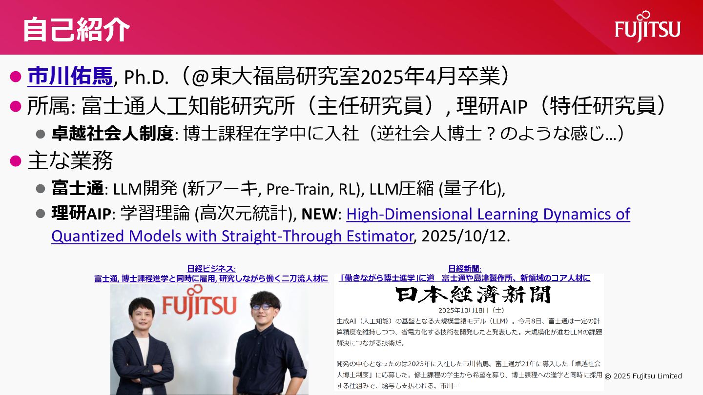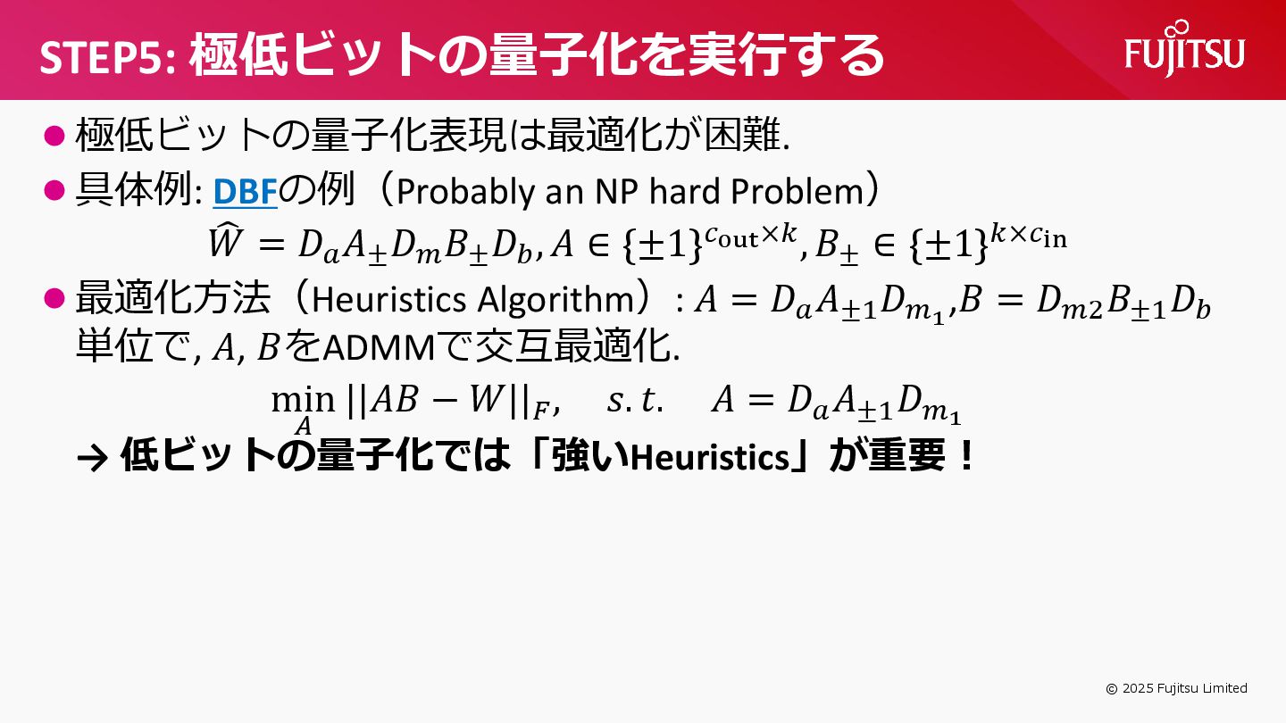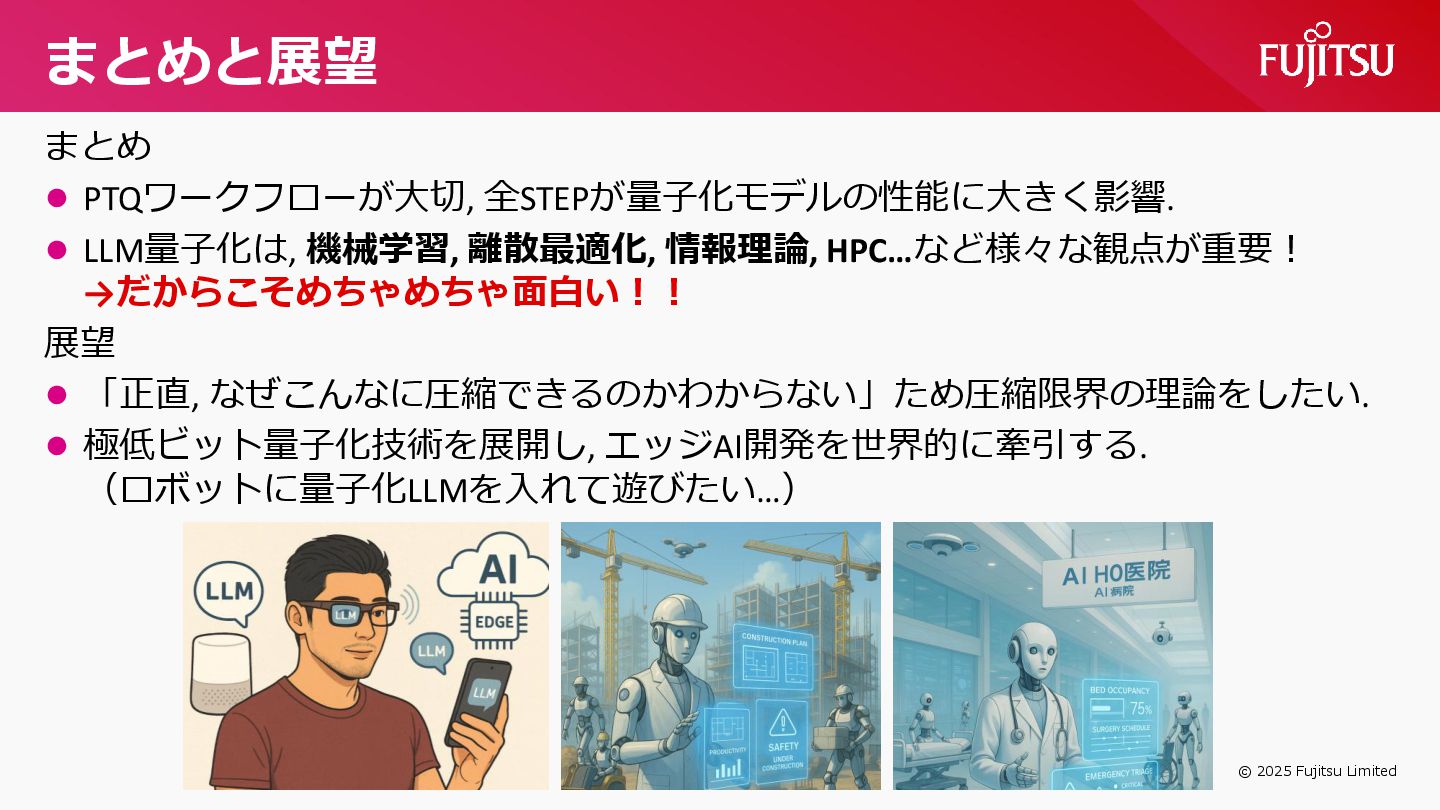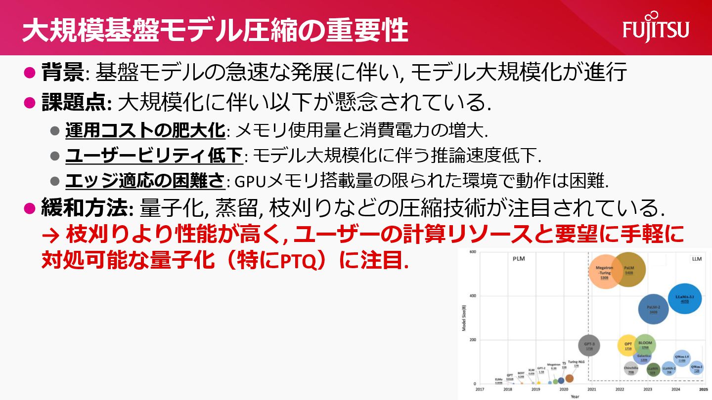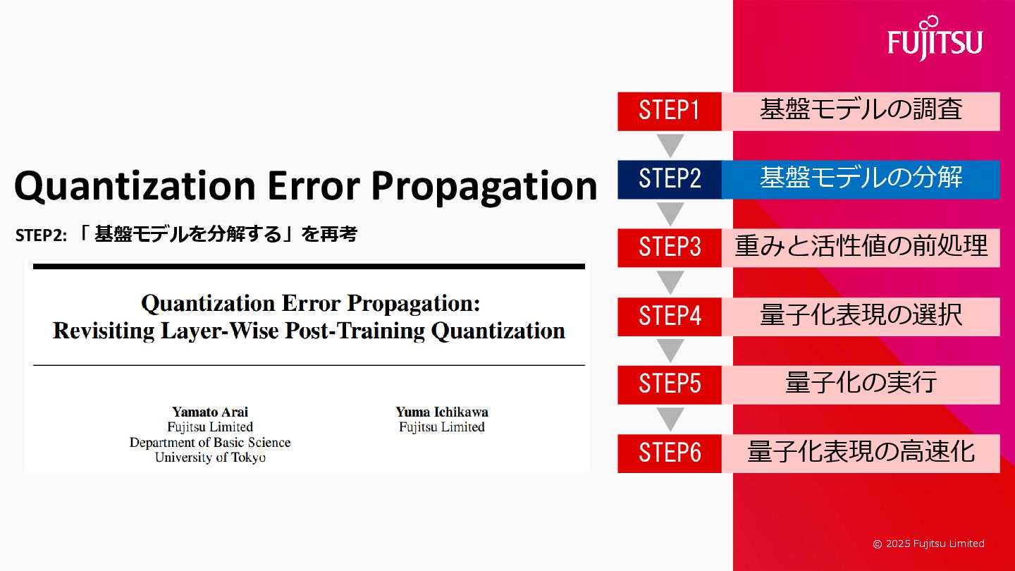 近年, LLM(Large Language Model)の大規模化に伴い, 推論速度の低下, メモリ使用量の増大, および電力コストの上昇といった課題が顕在化している. これらの課題に対処するため, 実数表現を離散化し計算効率を向上させる量子化技術が注目されている. しかし, LLMの量子化において, 極低ビット量子化の実現は困難であることが報告されている. 我々はこの課題に挑戦し, 1bitの極低ビット量子化であっても標準ベンチマーク上で平均90%の性能を維持することに成功した. その成果は, 最近のプレスリリースにて報告している. 本講演では, この成果に至るまでの研究ロードマップを示すとともにLLM量子化のワークフローおよび最新動向を体系的に概観する. さらに, 我々が開発した独自技術である量子化誤差伝搬(Quantization Error Propagation: QEP)および疑似量子アニーリング(Quasi-Quantum Annealing: QQA)の設計思想とその効果を簡単に説明する. そして, 最後に1bit量子化の先にある持続可能な推論基盤への展望を提示する.
