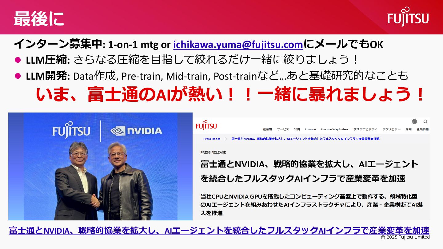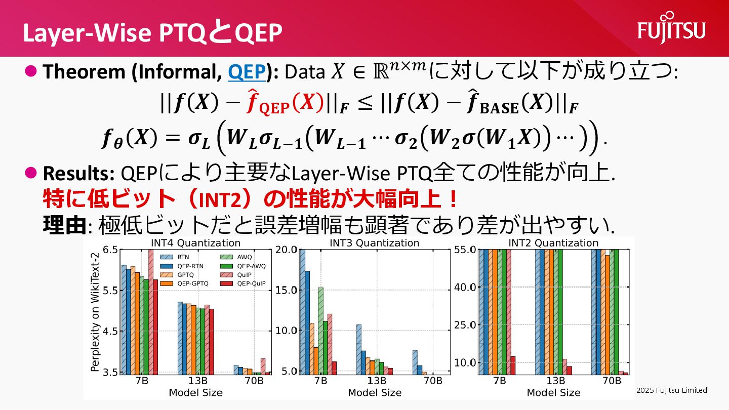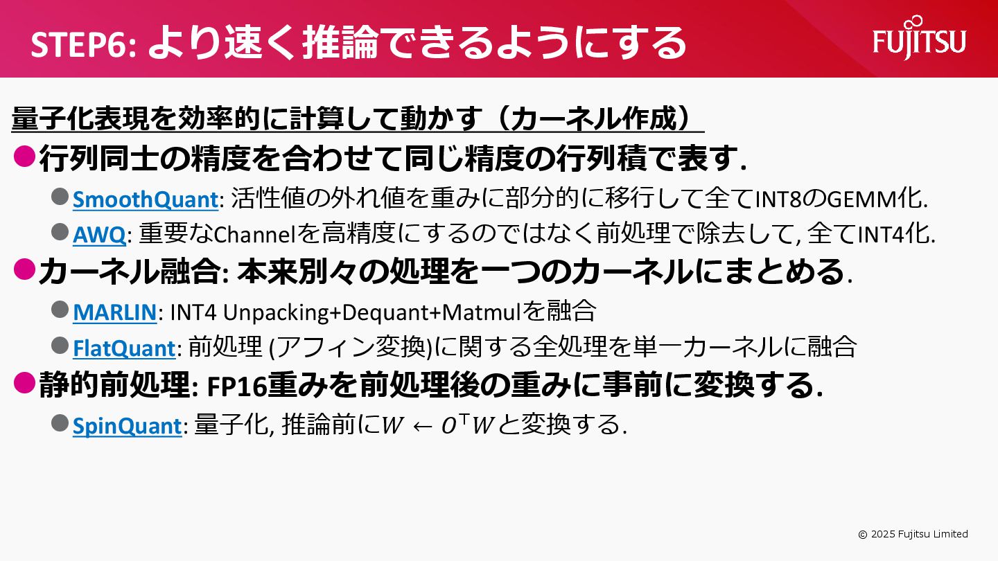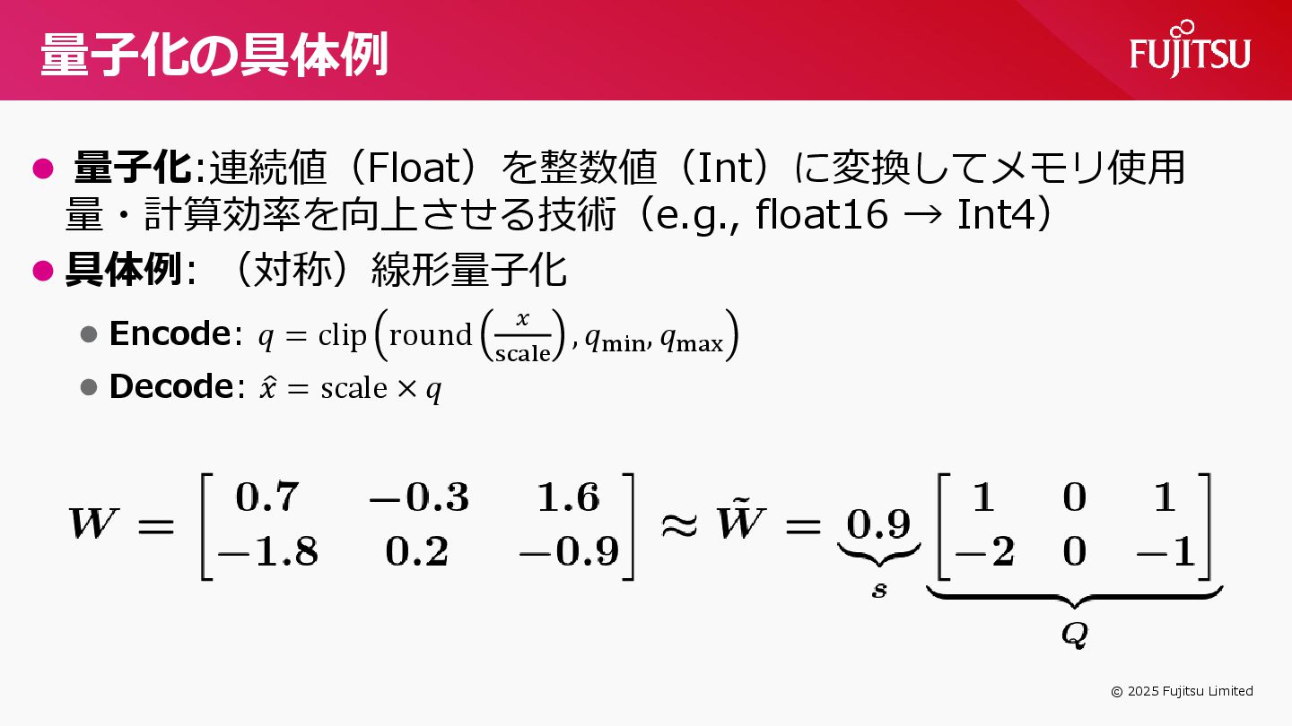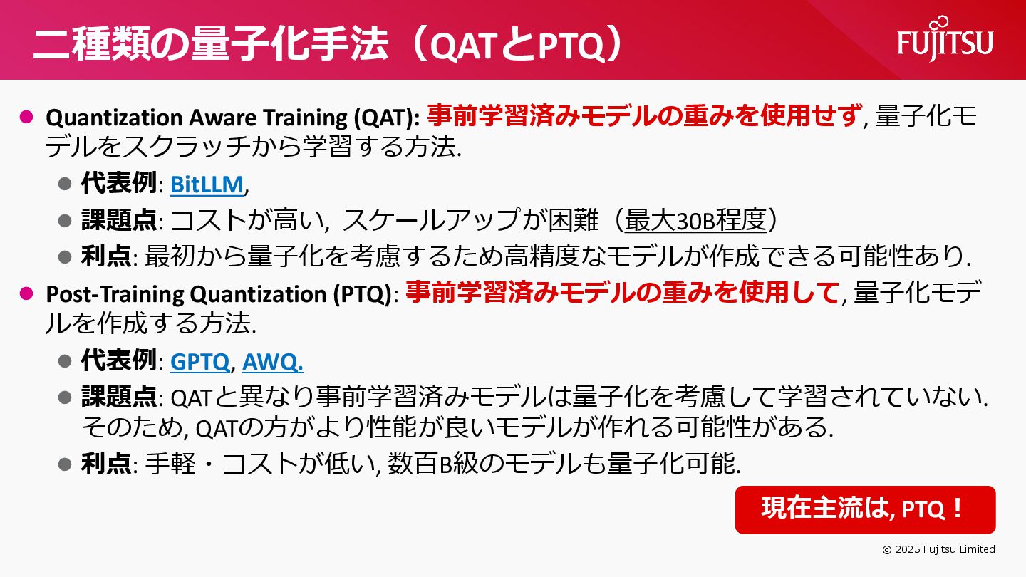 近年, LLM(Large Language Model)の大規模化に伴い, 推論速度の低下, メモリ使用量の増大, および電力コストの上昇といった課題が顕在化している. これらの課題に対処するため, 実数表現を離散化し計算効率を向上させる量子化技術が注目されている. しかし, LLMの量子化において, 極低ビット量子化の実現は困難であることが報告されている. 我々はこの課題に挑戦し, 1bitの極低ビット量子化であっても標準ベンチマーク上で平均90%の性能を維持することに成功した. その成果は, 最近のプレスリリースにて報告している. 本講演では, この成果に至るまでの研究ロードマップを示すとともにLLM量子化のワークフローおよび最新動向を体系的に概観する. さらに, 我々が開発した独自技術である量子化誤差伝搬(Quantization Error Propagation: QEP)および疑似量子アニーリング(Quasi-Quantum Annealing: QQA)の設計思想とその効果を簡単に説明する. そして, 最後に1bit量子化の先にある持続可能な推論基盤への展望を提示する.