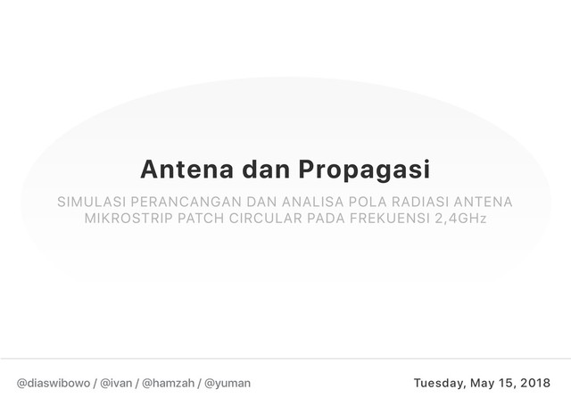 dilihat dari nilai parameter- parameter antena tersebut. Parameter Keterangan N I L A I Perhitungan Optimasi Optimasi r Jari-jari Patch 17,46 17 16 4,9 0,8 1,5 16,44 16,44 13 0,035 0,035 0,35 1,6 1,6 1,6 44,52 43,6 43,6 56,16 55,24 43 Lebar Feed Panjang Feed Tebal Konduktor Tebal Dielektrik Lebar Groundplane Panjang Groundplane wf lf t h wg lg Unidireksional omnidireksional Tuesday, May 15, 2018