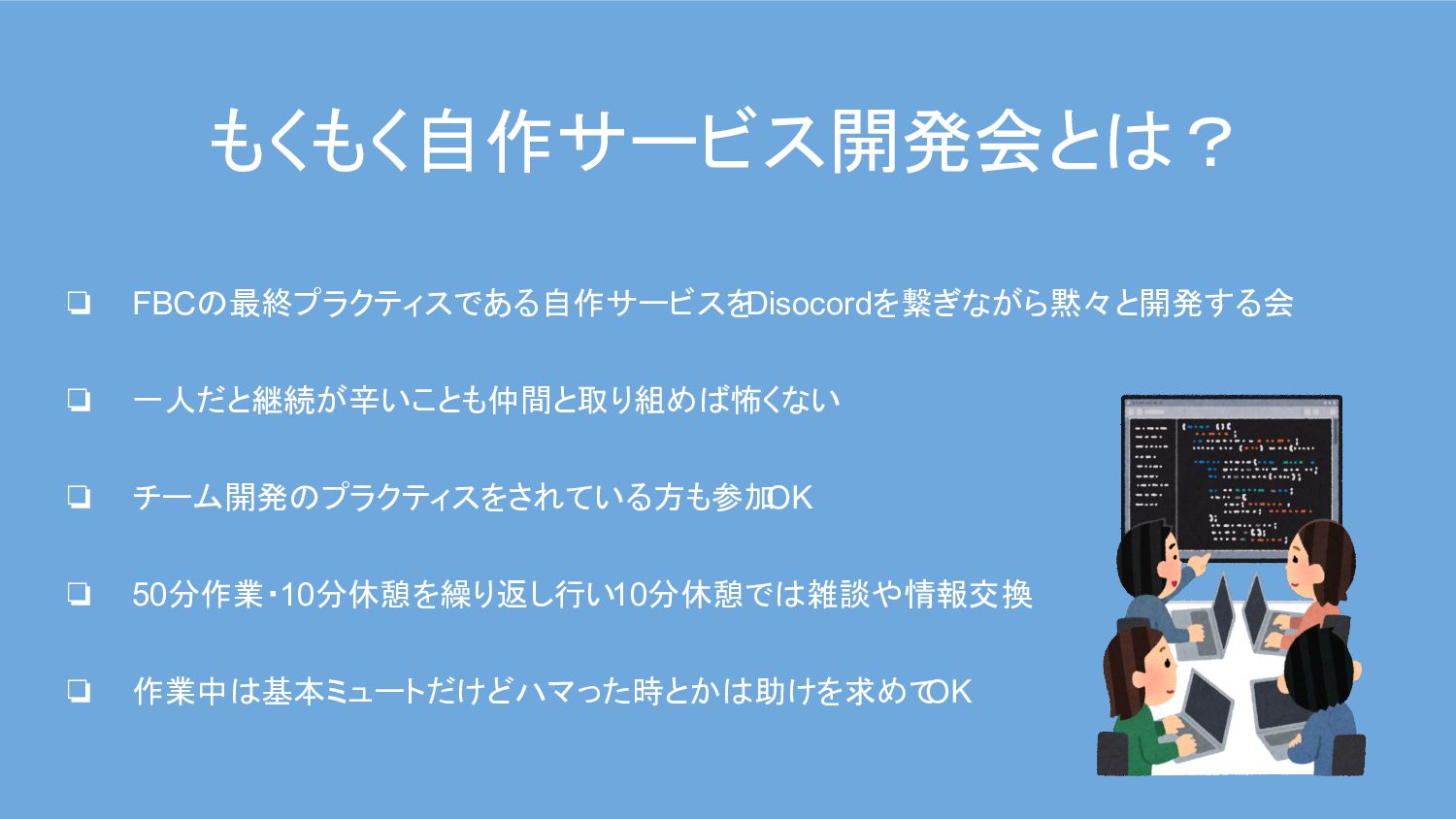 もくもく自作サービス開発会とは? ❏ FBCの最終プラクティスである自作サービスを Disocordを繋ぎながら黙々と開発する会 ❏ 一人だと継続が辛いことも仲間と取り組めば怖くない ❏ チーム開発のプラクティスをされている方も参加 OK ❏