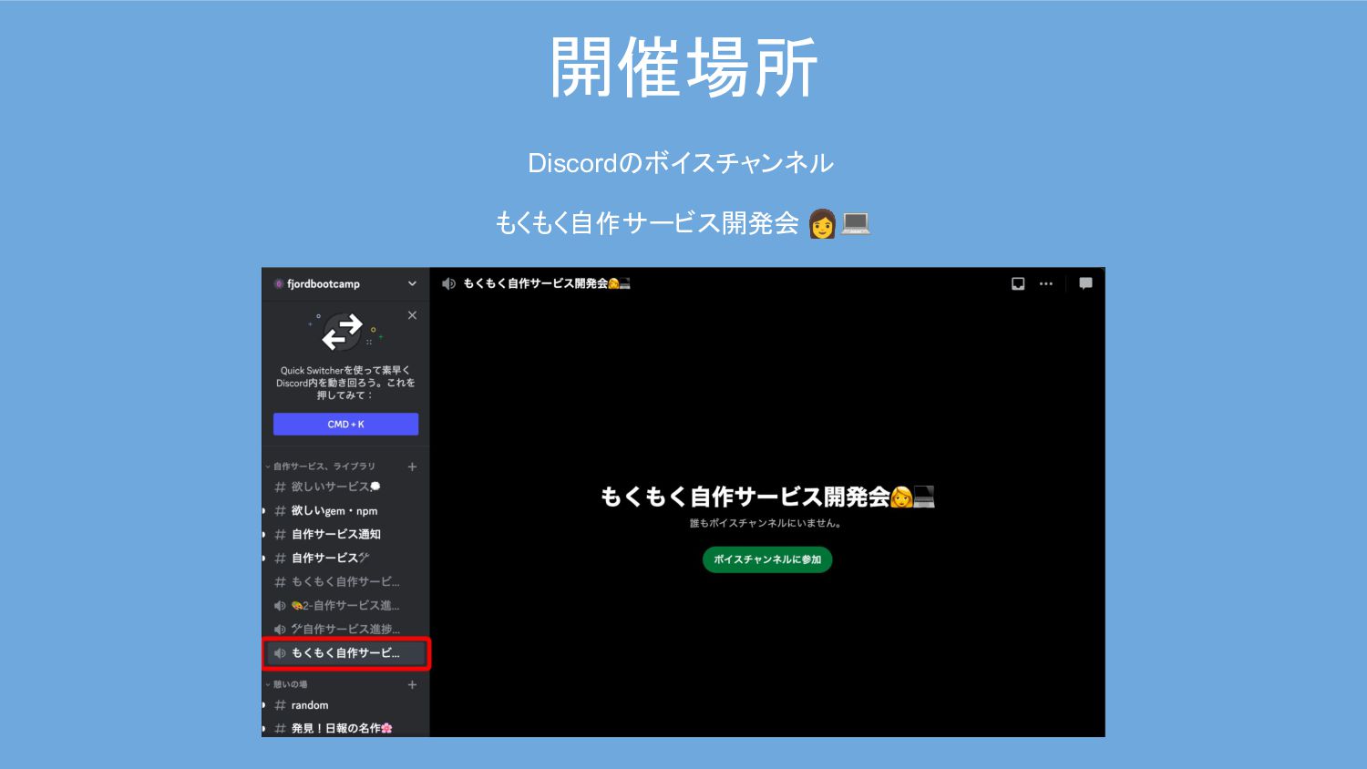 開催場所 Discordのボイスチャンネル もくもく自作サービス開発会 👩💻
