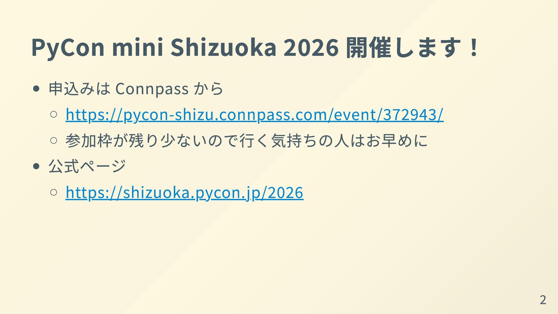 公式ページ https://shizuoka.pycon.jp/2026 2