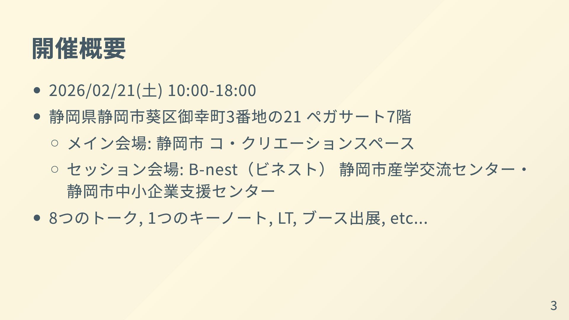 開催概要 2026/02/21(土) 10:00-18:00 静岡県静岡市葵区御幸町3番地の21 ペガサート7階 メイン会場: 静岡市 コ・クリエーションスペース セッション会場: B-nest(ビネスト)