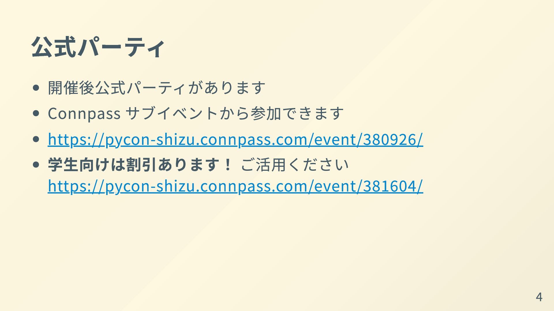 公式パーティ 開催後公式パーティがあります Connpass サブイベントから参加できます https://pycon-shizu.connpass.com/event/380926/ 学生向けは割引あります! ご活用ください https://pycon-shizu.connpass.com/event/381604/ 4