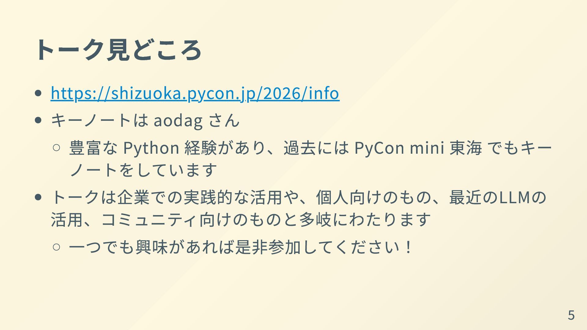 トーク見どころ https://shizuoka.pycon.jp/2026/info キーノートは aodag さん 豊富な Python 経験があり、過去には PyCon mini