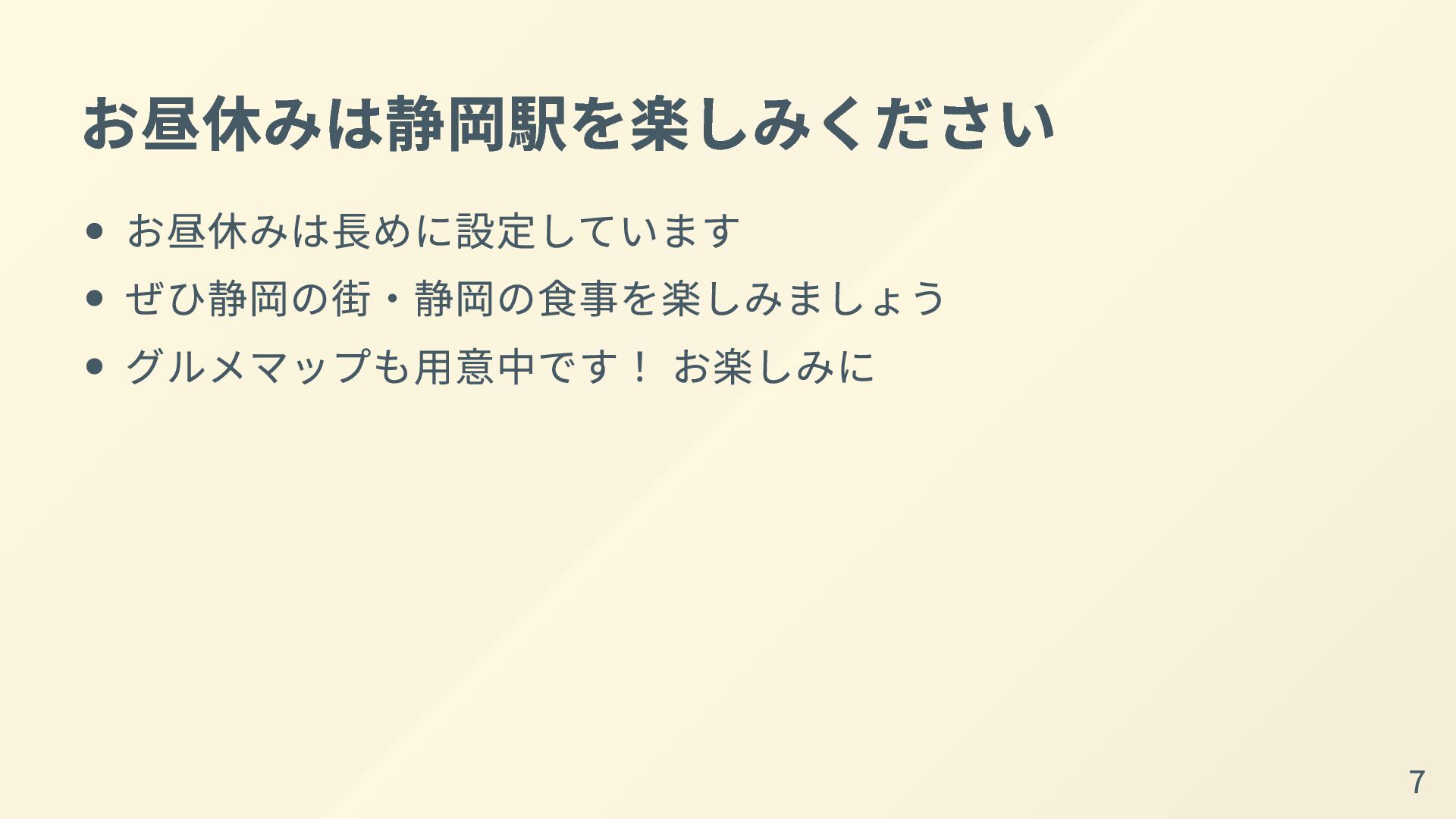 お昼休みは静岡駅を楽しみください お昼休みは長めに設定しています ぜひ静岡の街・静岡の食事を楽しみましょう グルメマップも用意中です! お楽しみに 7