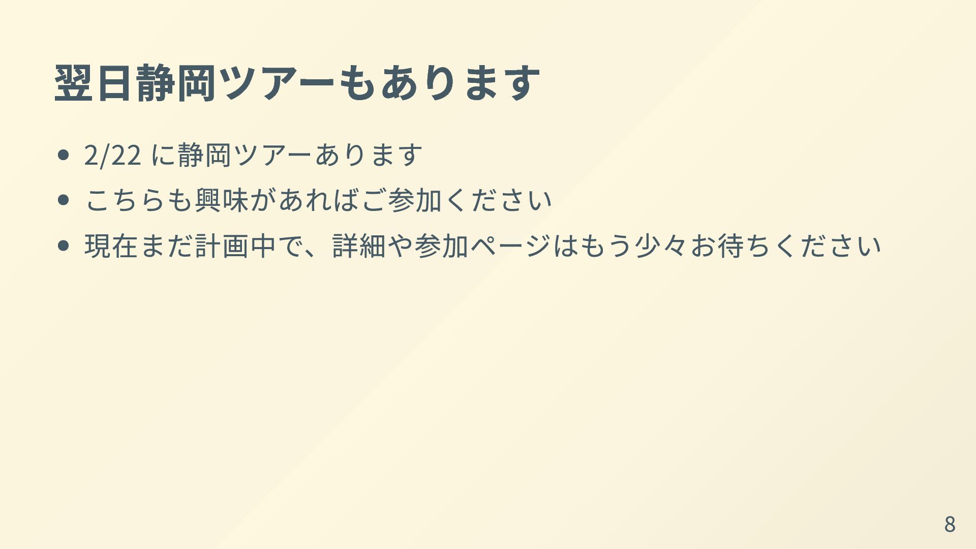 翌日静岡ツアーもあります 2/22 に静岡ツアーあります こちらも興味があればご参加ください 現在まだ計画中で、詳細や参加ページはもう少々お待ちください 8