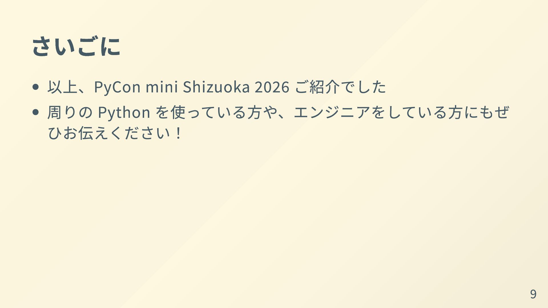 さいごに 以上、PyCon mini Shizuoka 2026 ご紹介でした 周りの Python を使っている方や、エンジニアをしている方にもぜ ひお伝えください!