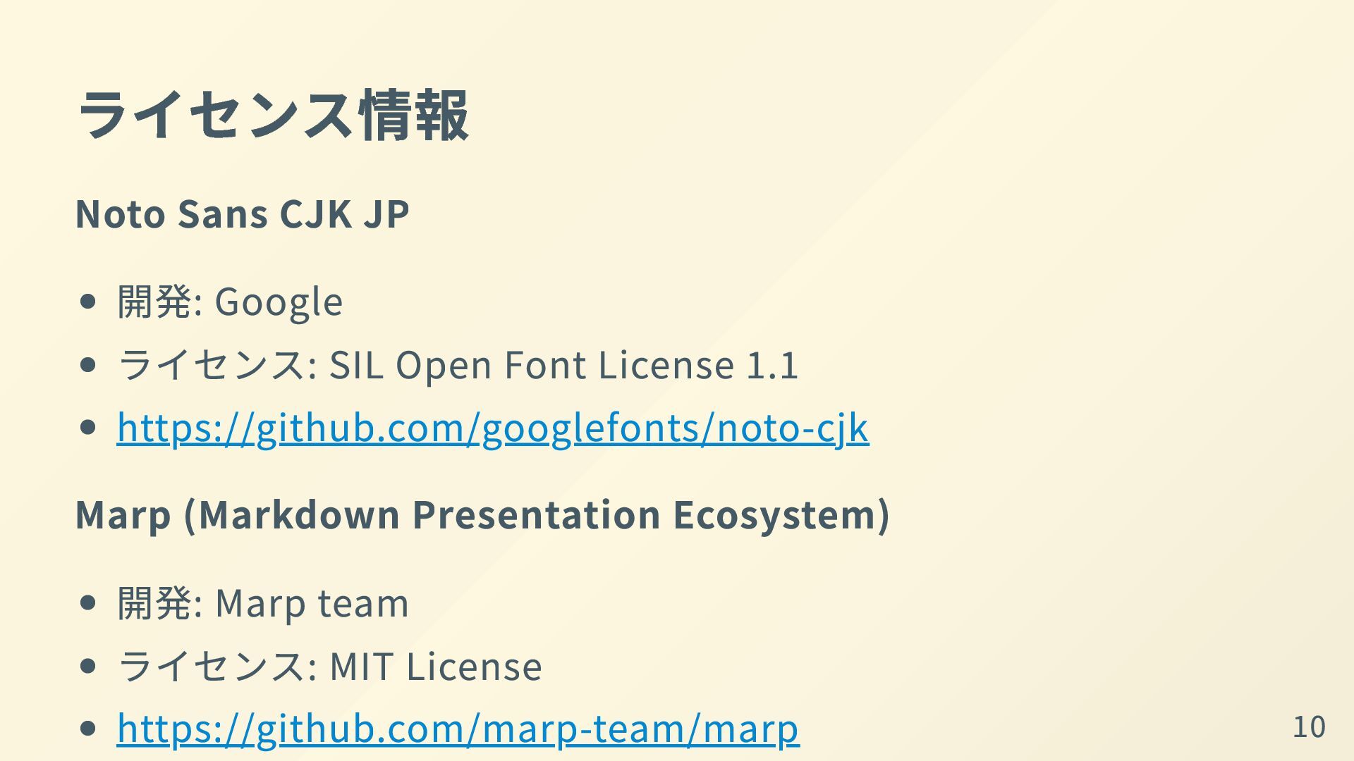 Font License 1.1 https://github.com/googlefonts/noto-cjk Marp (Markdown Presentation Ecosystem) 開発: Marp team ライセンス: MIT License https://github.com/marp-team/marp 10