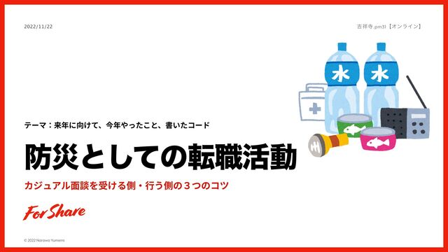 © 2022 Narawa Yumemi ࡂͱͯ͠ͷస৬׆ಈ カジュアル⾯談を受ける側‧⾏う側の3つのコツ 2022/11/22 ٢ࣉ.pm31ʲΦϯϥΠϯʳ テーマ:来年に向けて、今年やったこと、書いたコード F