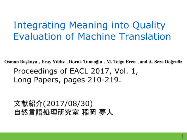 EACL 2017, Vol. 1, Long Papers, pages 210-219. 1 文献紹介(2017/08/30) 自然言語処理研究室 稲岡 夢人