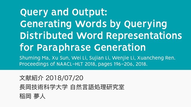 for Paraphrase Generation Shuming Ma, Xu Sun, Wei Li, Sujian Li, Wenjie Li, Xuancheng Ren. Proceedings of NAACL-HLT 2018, pages 196-206, 2018. จݙհ Ԭٕज़Պֶେֶࣗવݴޠॲཧݚڀࣨ ҴԬເਓ