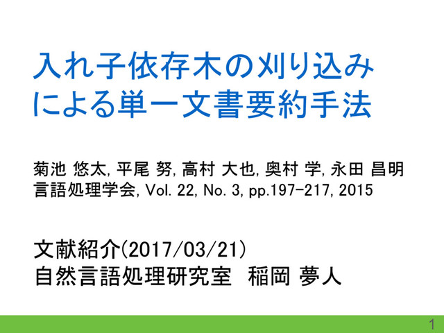 永田 昌明 言語処理学会, Vol. 22, No. 3, pp.197-217, 2015 1 文献紹介(2017/03/21) 自然言語処理研究室 稲岡 夢人