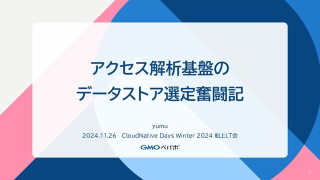 アクセス解析基盤の データストア選定奮闘記 yumu 2024.11.26 CloudNative Days Winter 2024 船上LT会 1