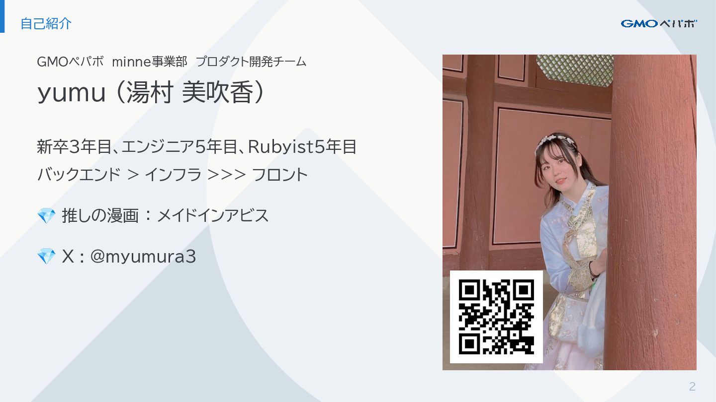 2 自己紹介 GMOペパボ minne事業部 プロダクト開発チーム yumu (湯村 美吹香) 新卒3年目、エンジニア5年目、Rubyist5年目 バックエンド > インフラ