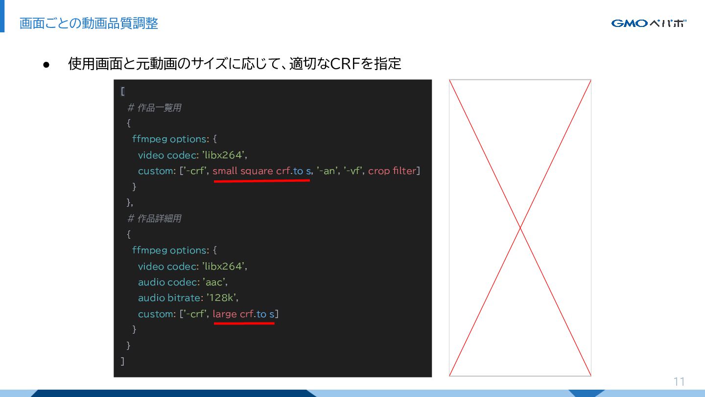 11 画面ごとの動画品質調整 • 使用画面と元動画のサイズに応じて、適切なCRFを指定 [ # 作品一覧用 { ffmpeg_options: {